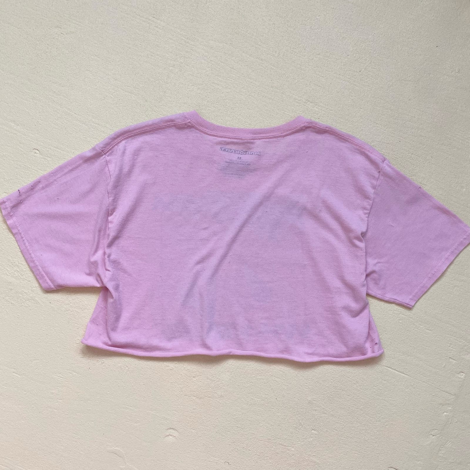 reworked distressed oversized pink cropped short sleeve t-shirt with mario kart racing graphic on front. cutoff raw bottom hem. lightweight stretchy worn cotton blend fabric. marked men's size M, fits oversized women's