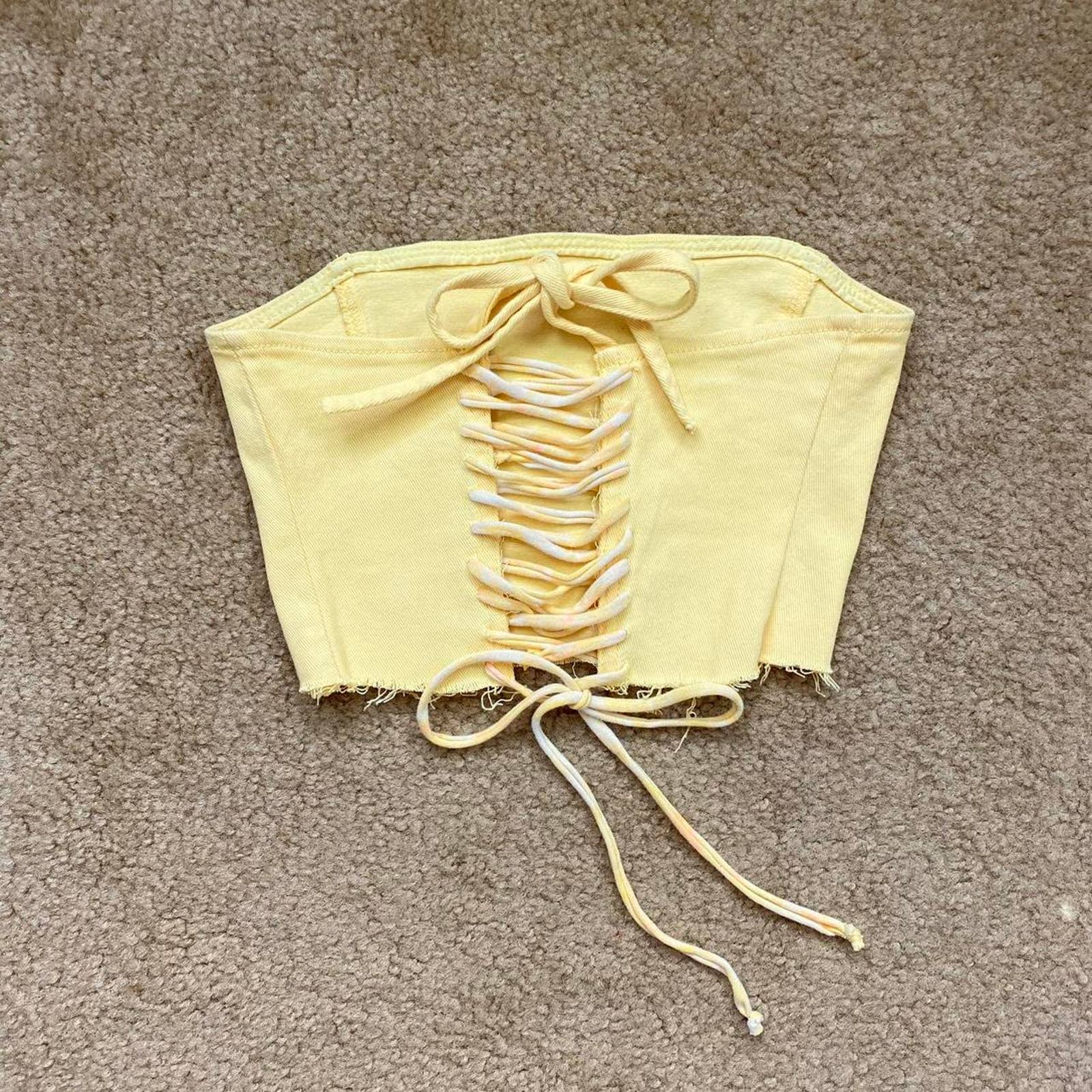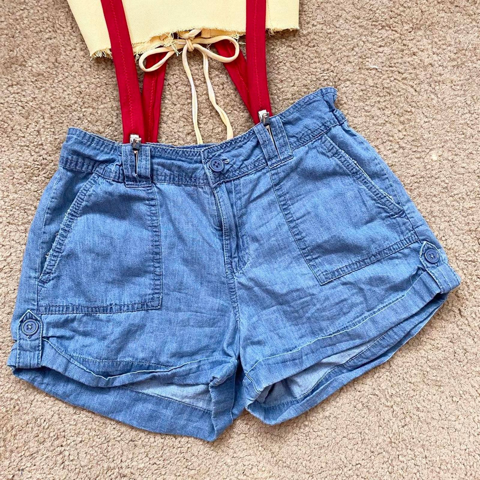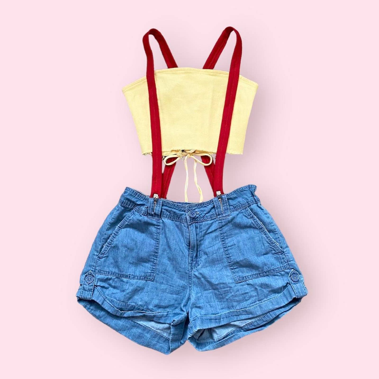 misty pokémon cosplay halloween costume - yellow tube top stretch denim bustier with lace up back, red soft cotton stretch suspenders & blue high rise denim shorts set. Misty’s / Kasumi’s signature outfit. shorts have darts around waist & suspenders attached with hair clips & safety pins
