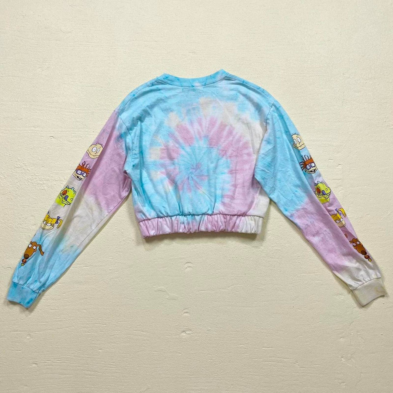 long sleeve pastel tie dye rugrats graphic print cropped long sleeve with character print down sleeves. elastic cinched waist. soft cotton fabric