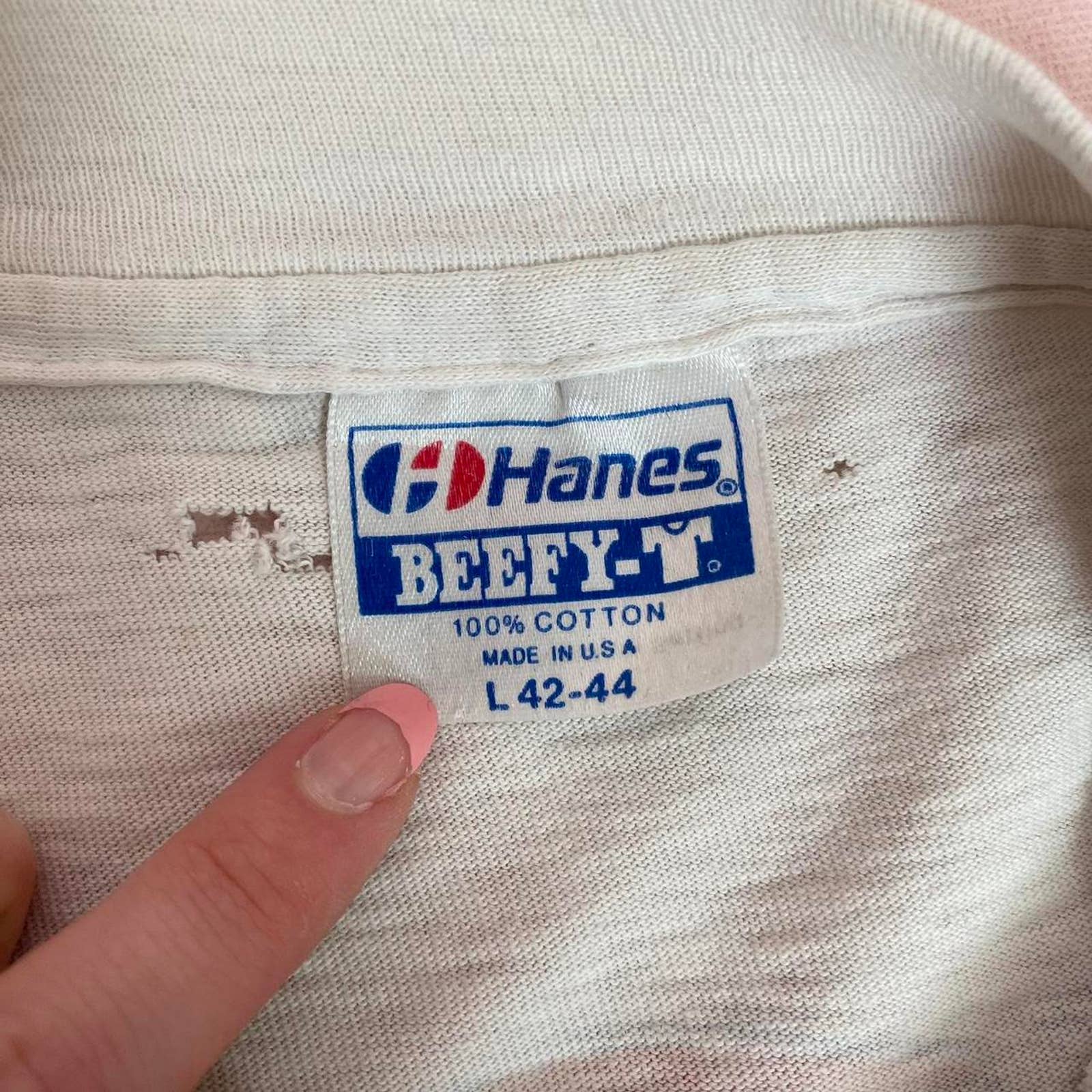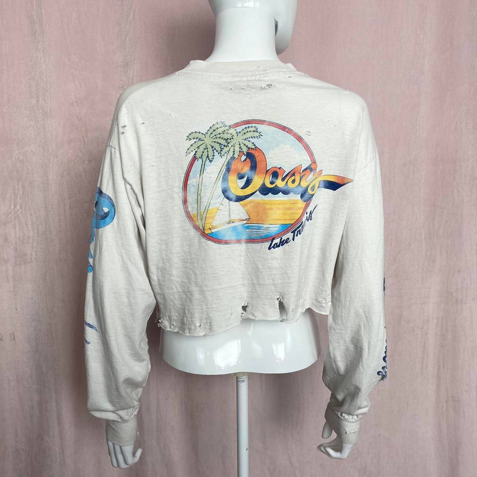 Hanes Beefy-T oversized faded white cropped ripped graphic long sleeve with Oasis Lake Travis print on arms, chest & back graphic. lightweight thin stretchy cotton. a tiny bit see through. loose fit