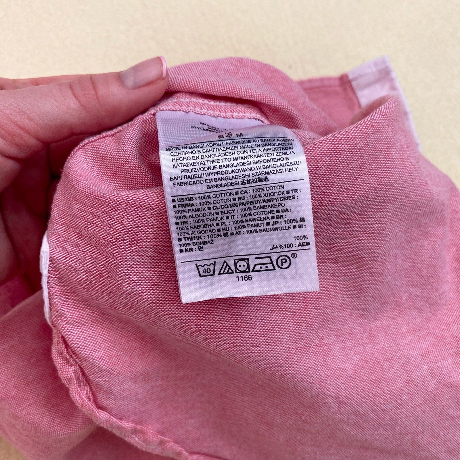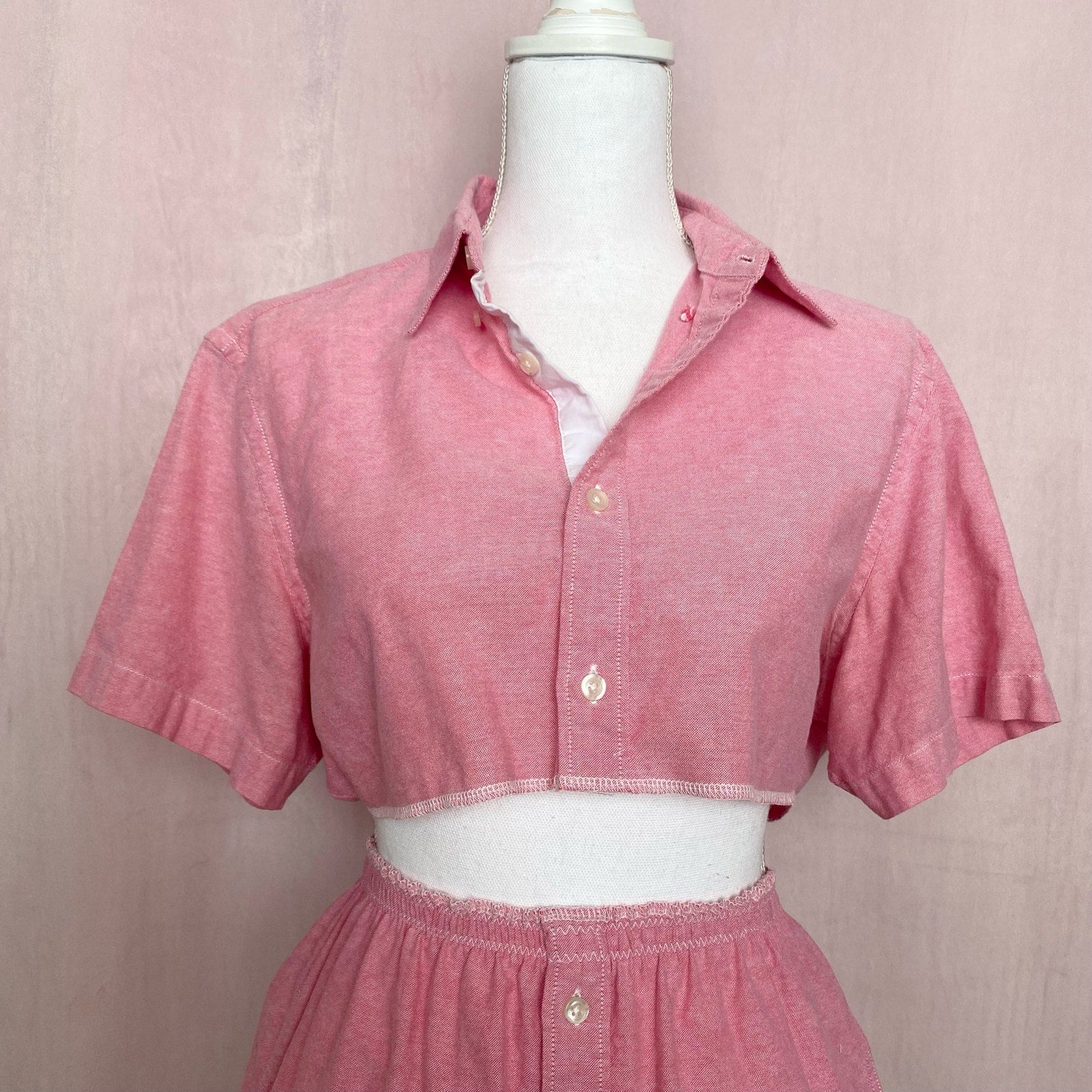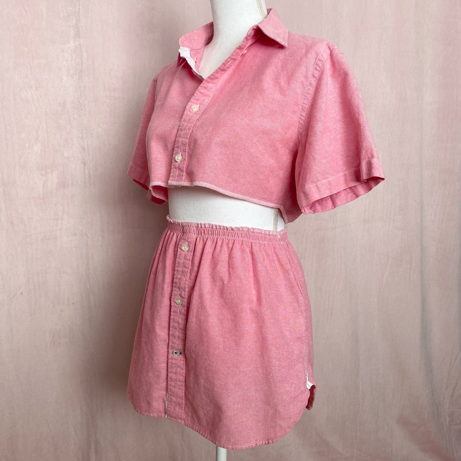 reworked gap heather pink cotton oversized short sleeve cropped collared button up top & matching high waisted pull on button front A-line mini skirt two piece set. soft woven cotton fabric. original piece marked size men’s M, set fits best women’s XS-small with 23-27” skirt waist. please see measurements for best fit!