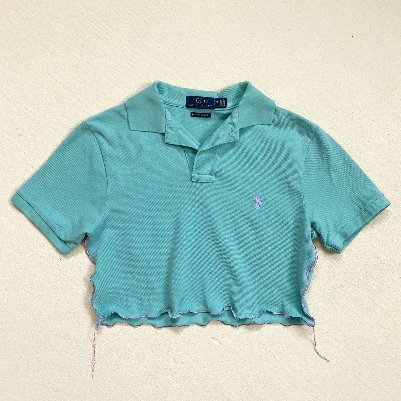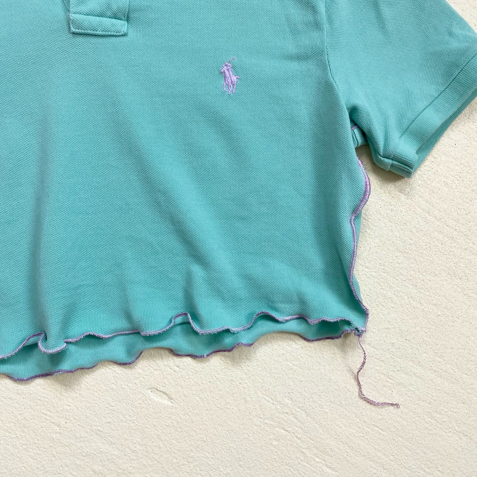 reworked Polo Ralph Lauren 'custom slim fit' mint green cropped polo short sleeve collared top with purple lettuce hem & side seam detail. dangly over-stich side detail. embroidered polo logo. cotton fabric