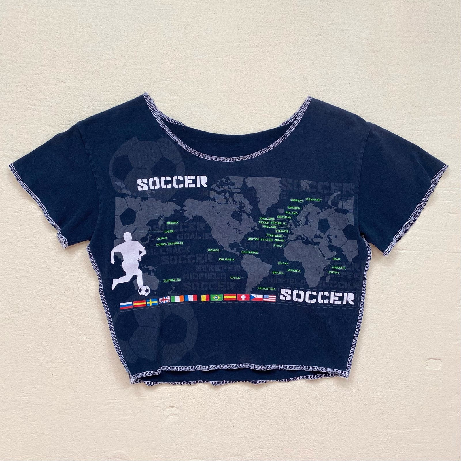 upcycled cropped soccer graphic short sleeve baby tee t-shirt. fits XS-small best. sturdy soft lightly stretchy cotton fabric. outside seem detail