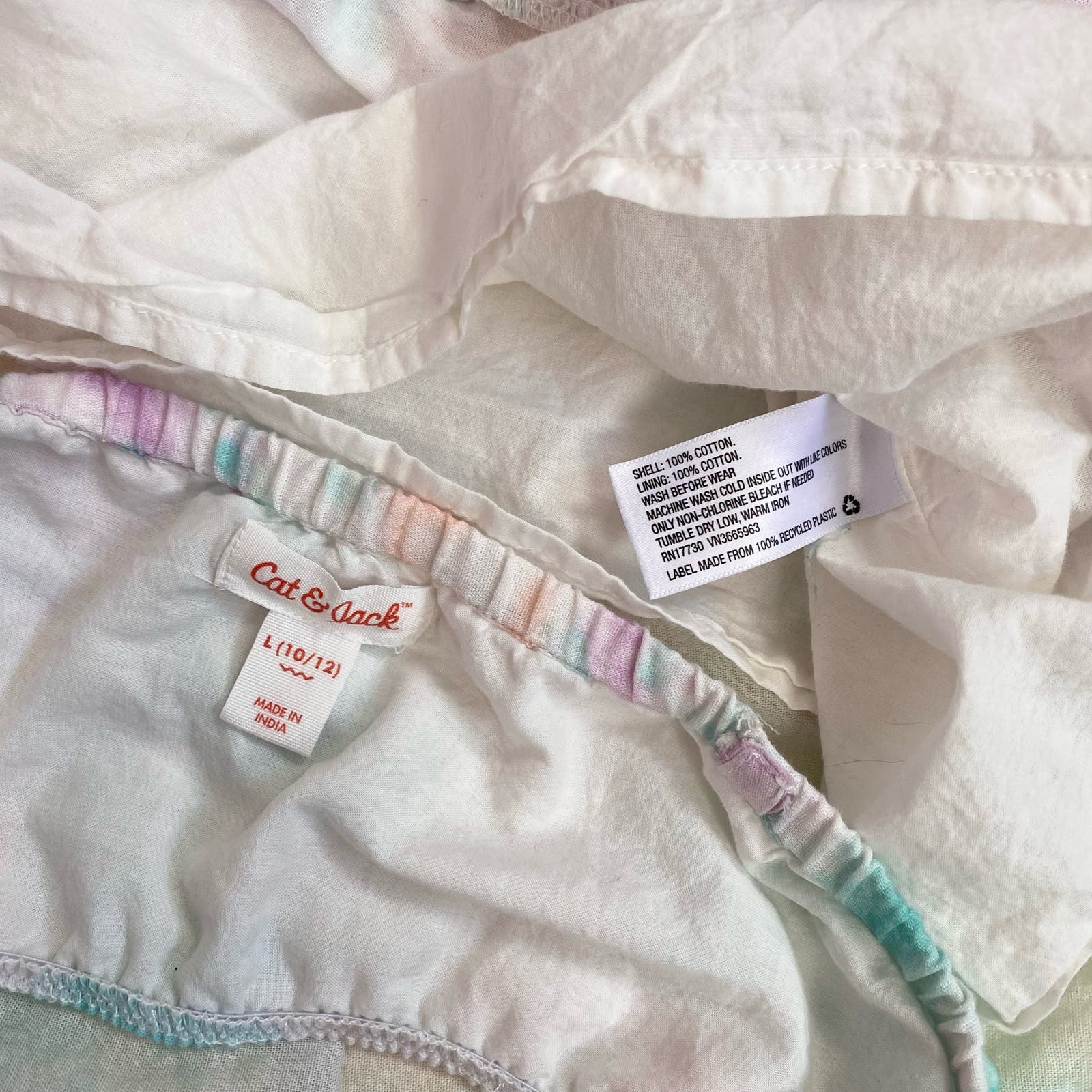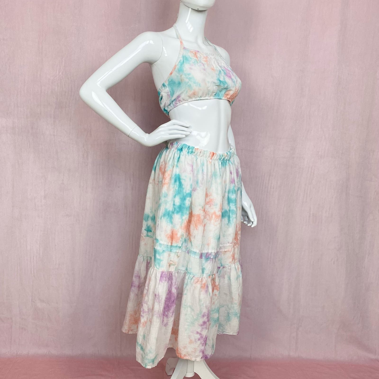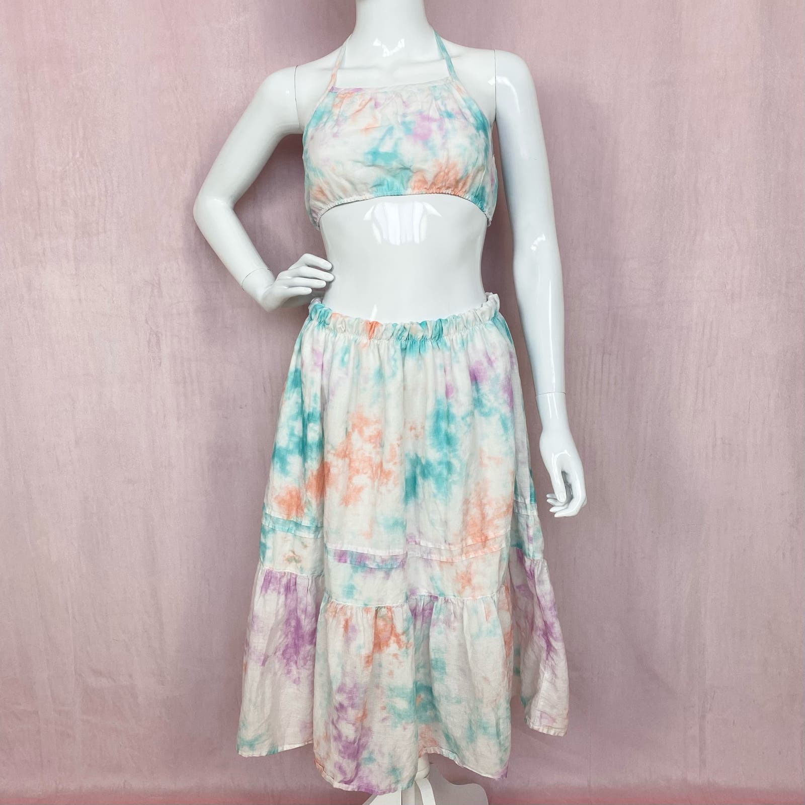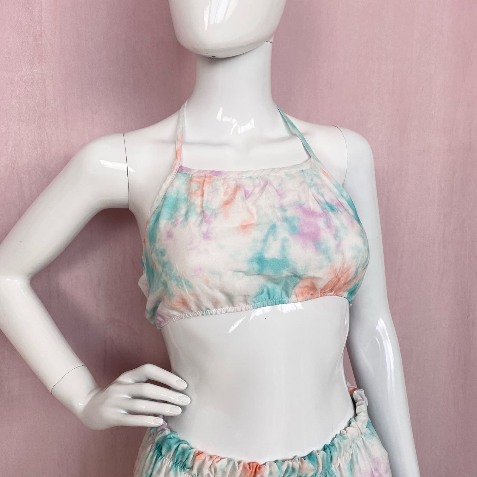 reworked Cat & Jack pastel tie dye halter bralette cropped tank top bralette with lining & midi tiered ruffle trim skirt with elastic 26”+ waist & lining. best for small chest. marked youth L, fits women’s XS-small, please see measurements!