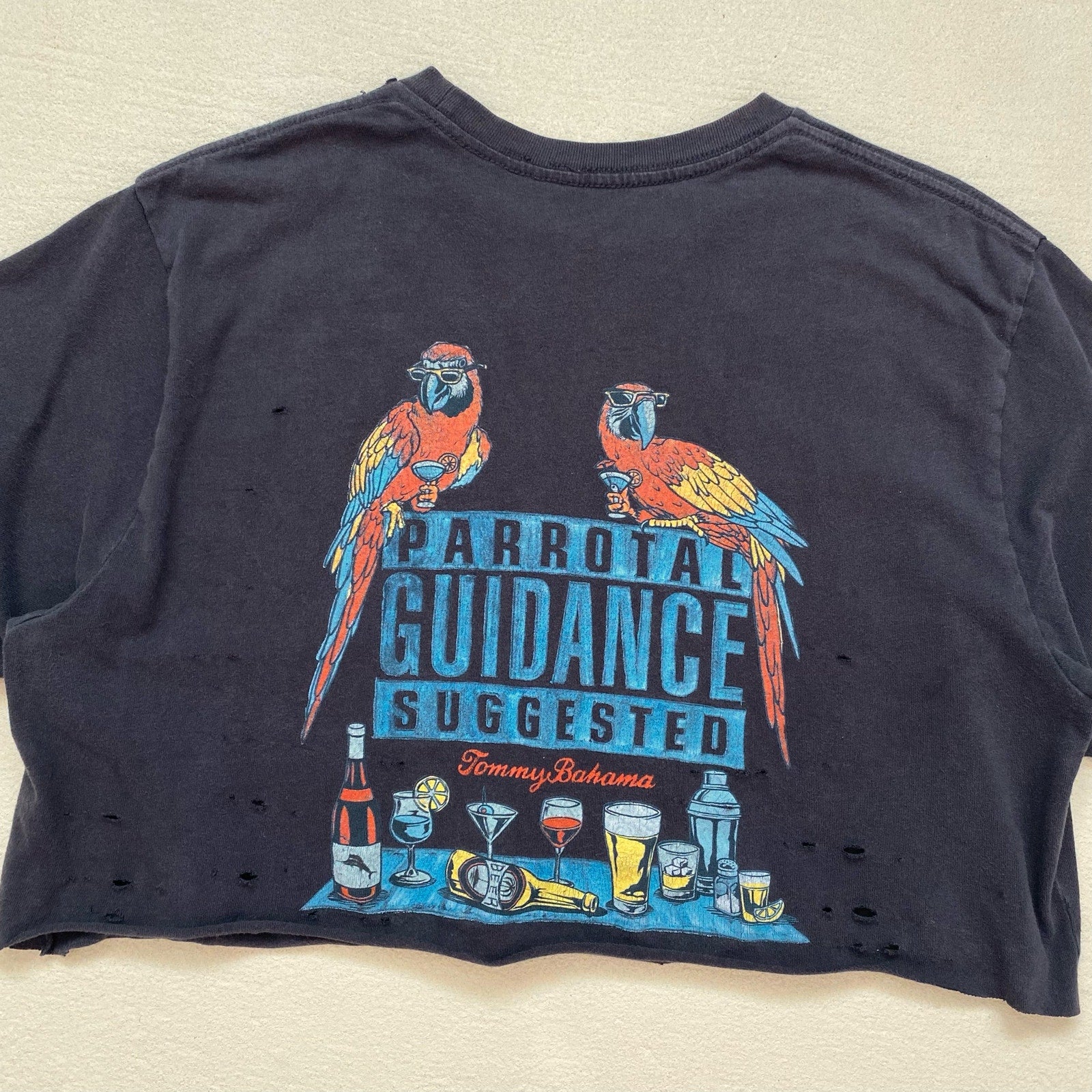 short sleeve distressed tommy bahama graphic cropped t-shirt with small cursive tommy bahama left chest front graphic & large parrot “parrotal guidance suggested” beer wine cocktail graphic on back. raw bottom hem. soft stretch cotton fabric. no size info, fits oversized up to XL