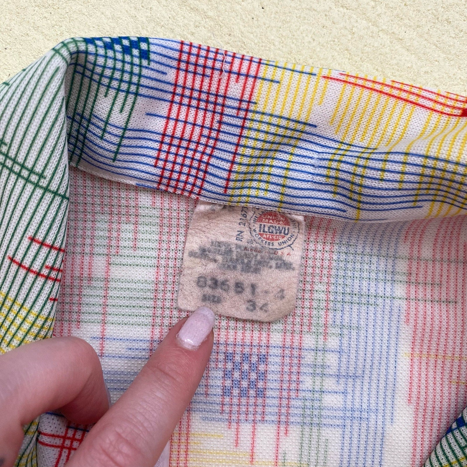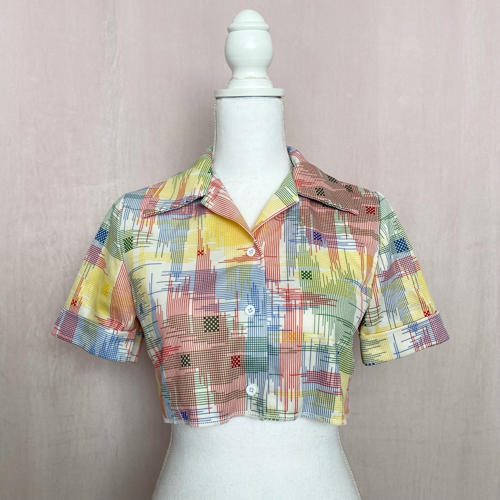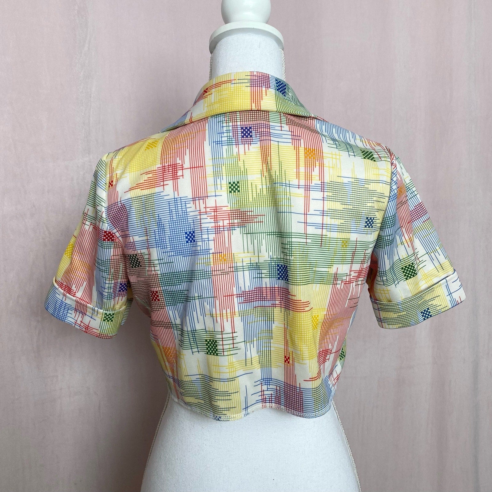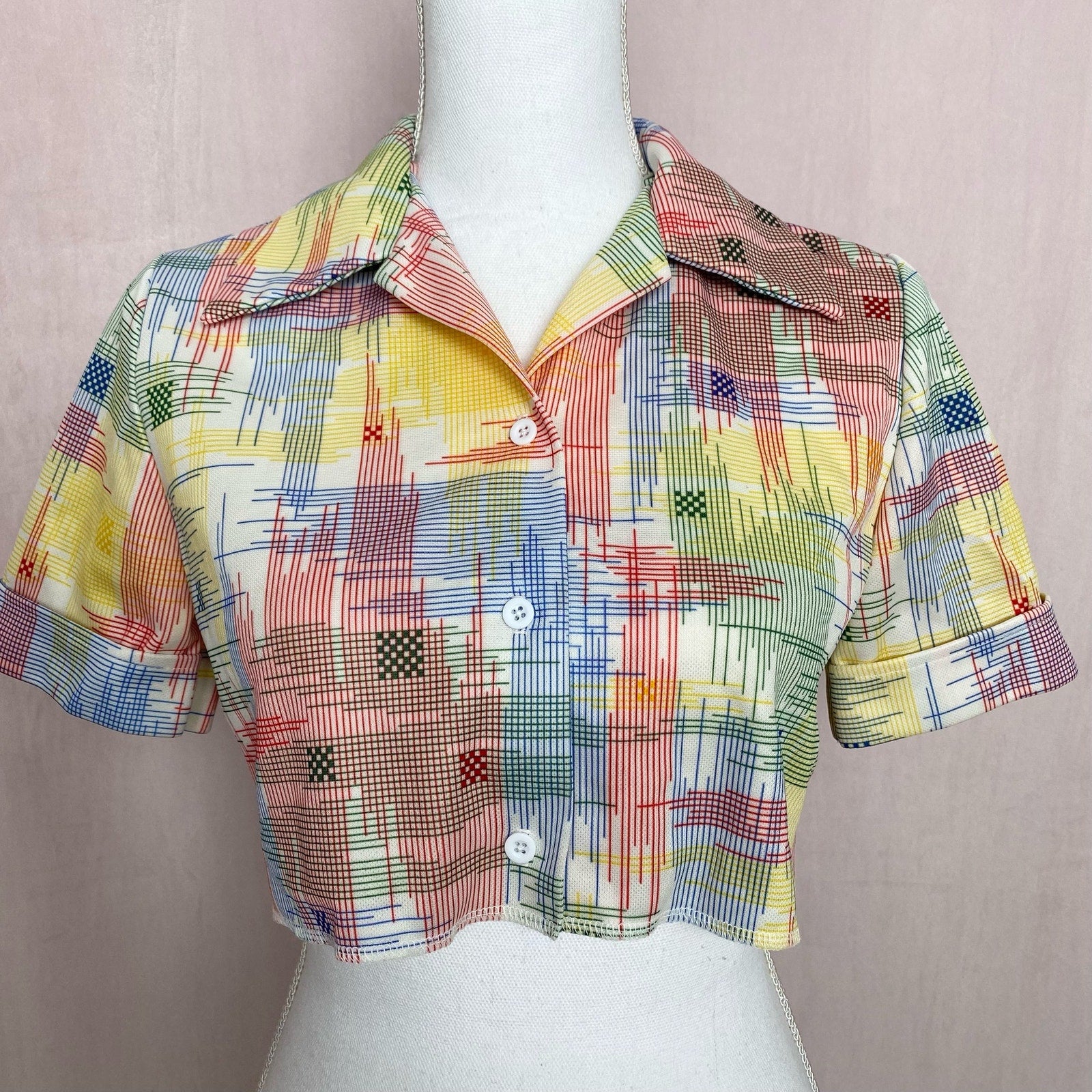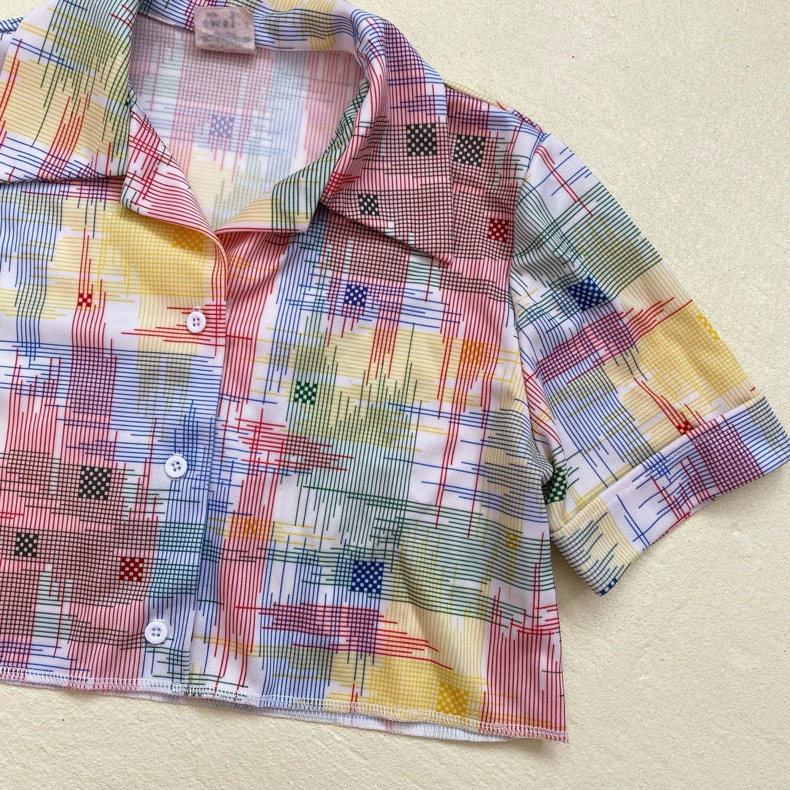 upcycled vintage 70s short sleeve abstract plaid print button up cropped collared shirt. cuffed sleeves. stretch fabric. marked vintage size 34 - fits small / xs best!