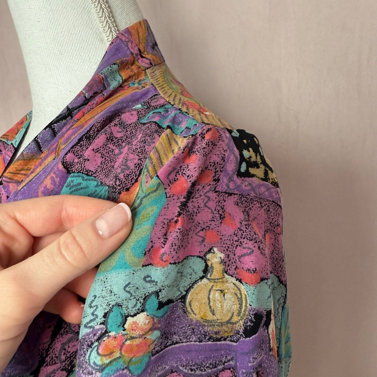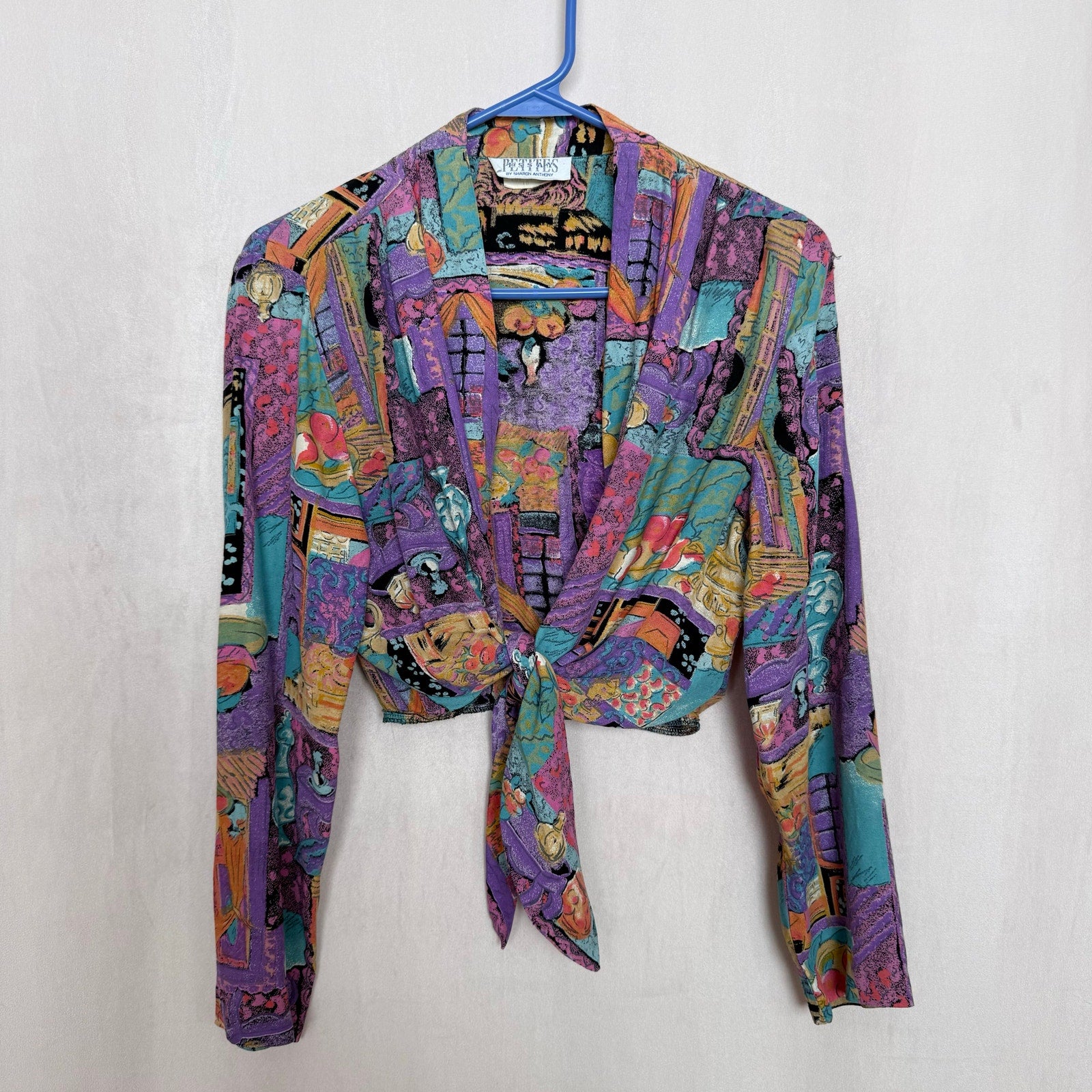 reworked vintage Essay Petites by Sharon Anthony floral fruit retro abstract print tie front long sleeve crop top lightweight cardigan. soft flowy lightweight rayon fabric. marked vtg size 10, best fits women's XS-small