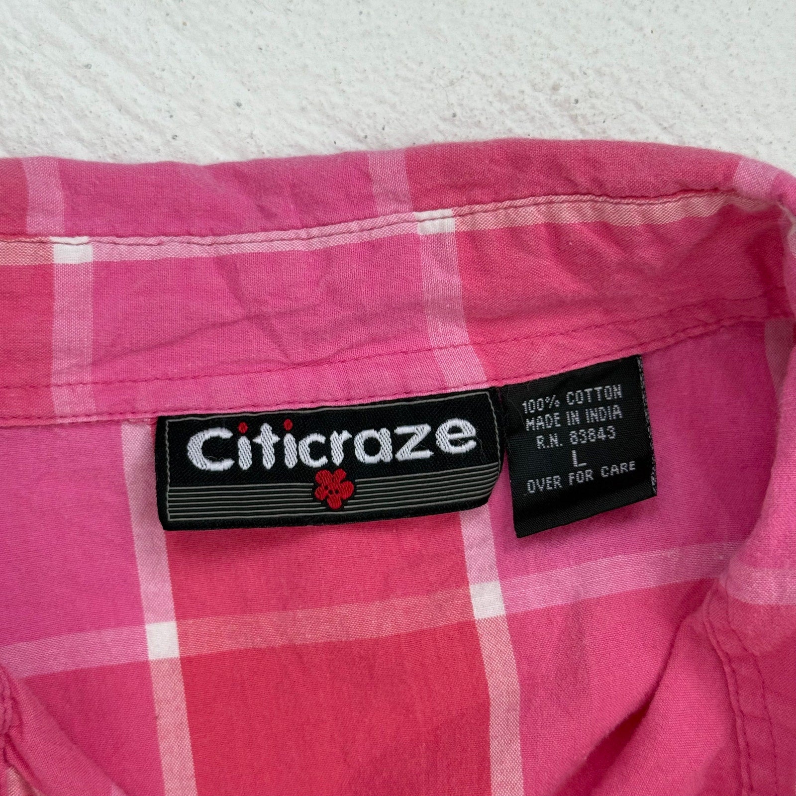 Upcycled Vintage Citicraze Pink Plaid Cropped Button Up Shirt, Size Large