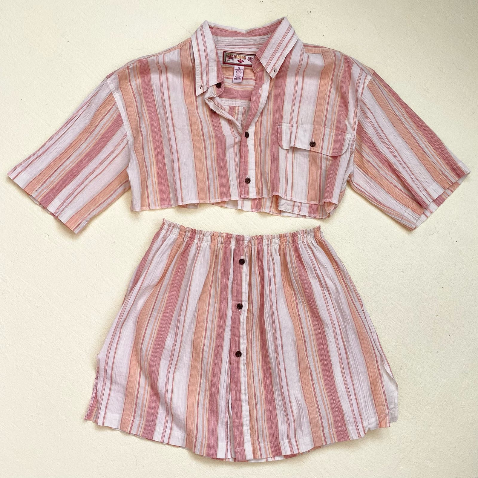 Upcycled Vintage Crop Button Up Shirt & Skirt Set, Size S/M