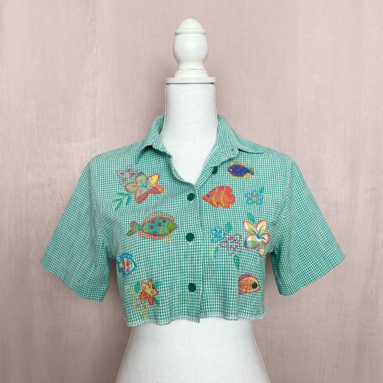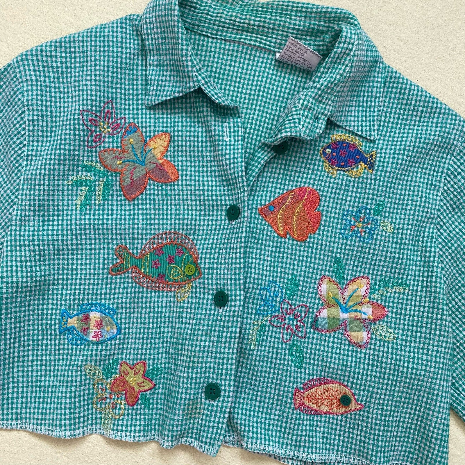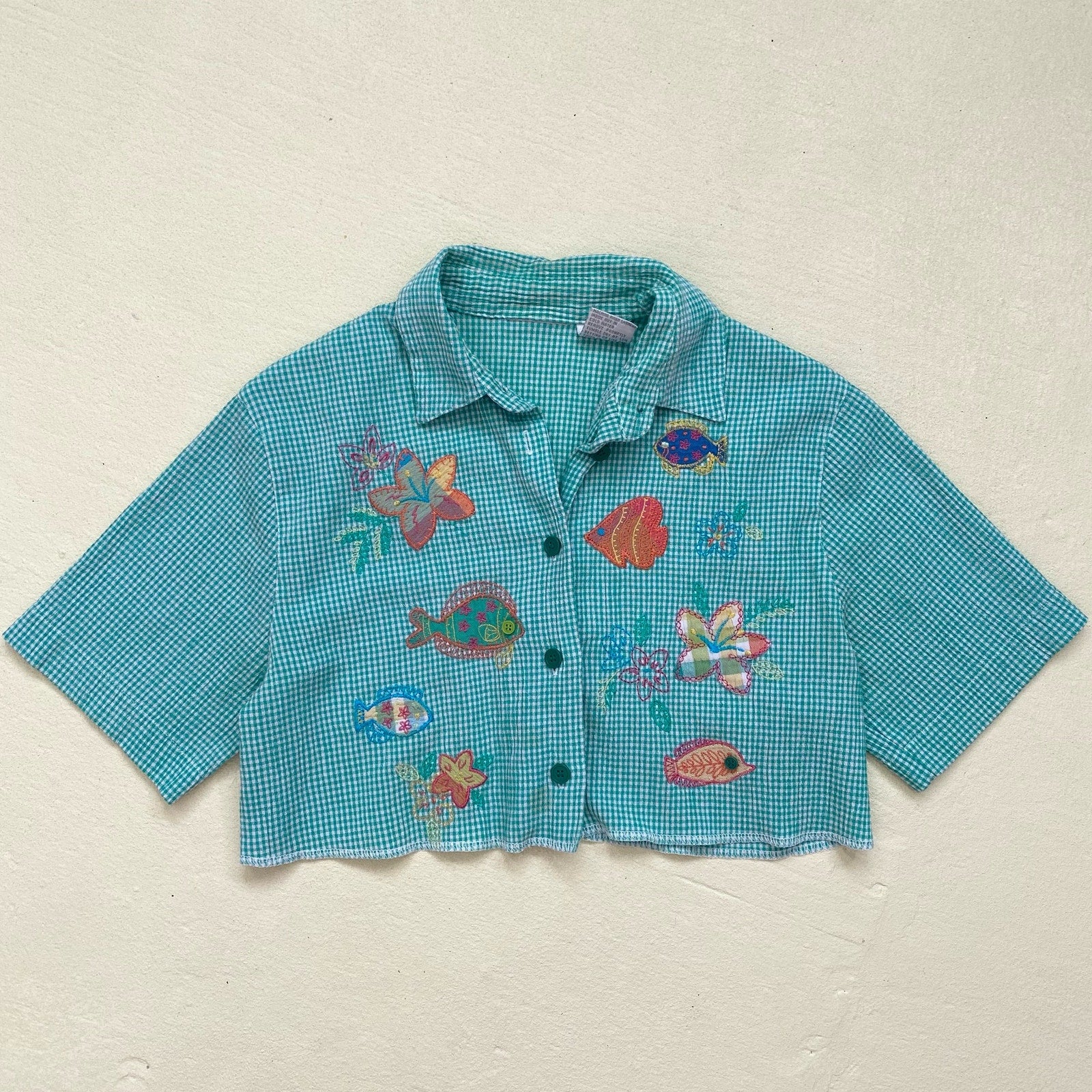 upcycled vintage Koret Francisca checkered short sleeve button up collared crop shirt with tropical floral & fish embroidery & patchwork on front. lightweight woven cotton blend fabric. marked size P, shown on small - please see measurements!