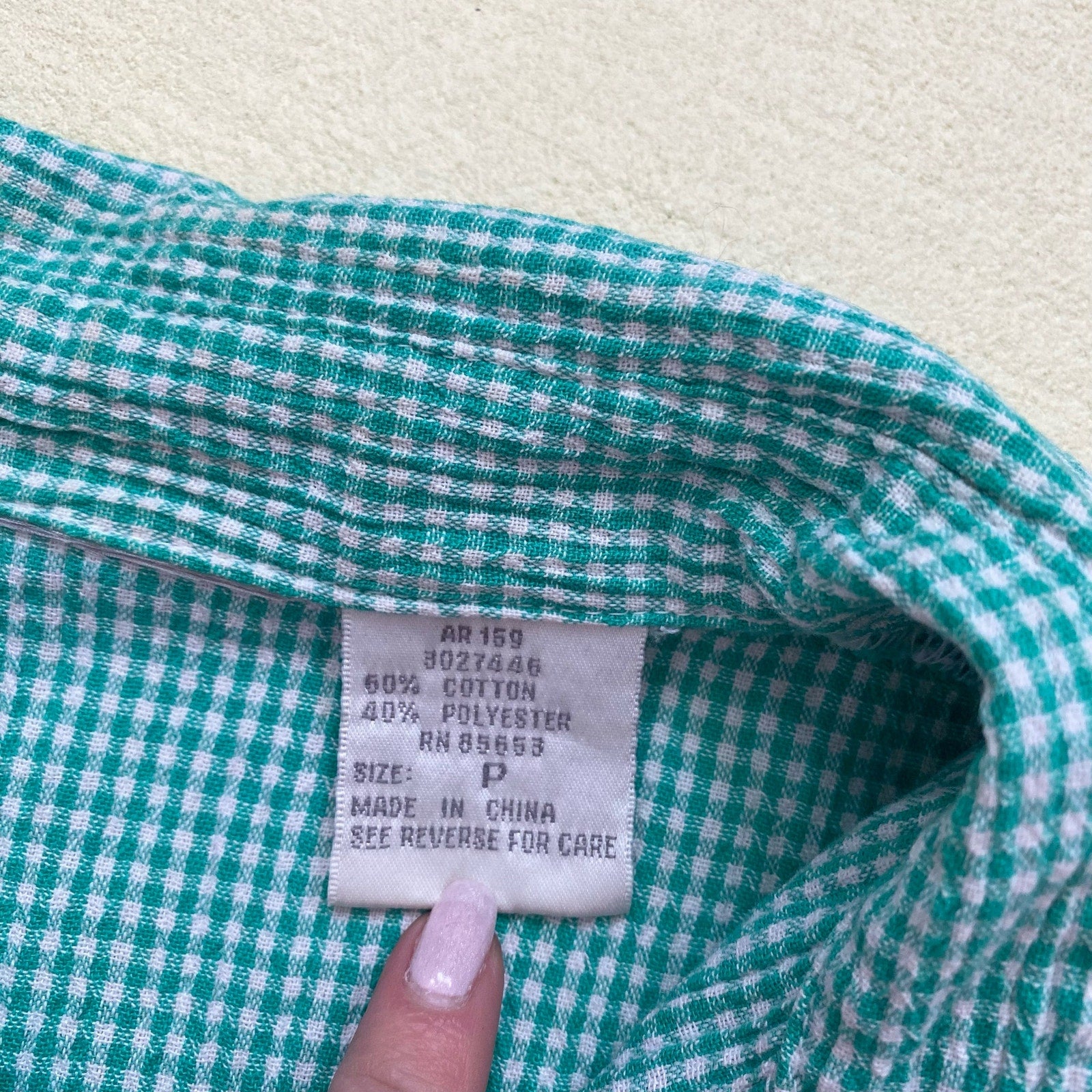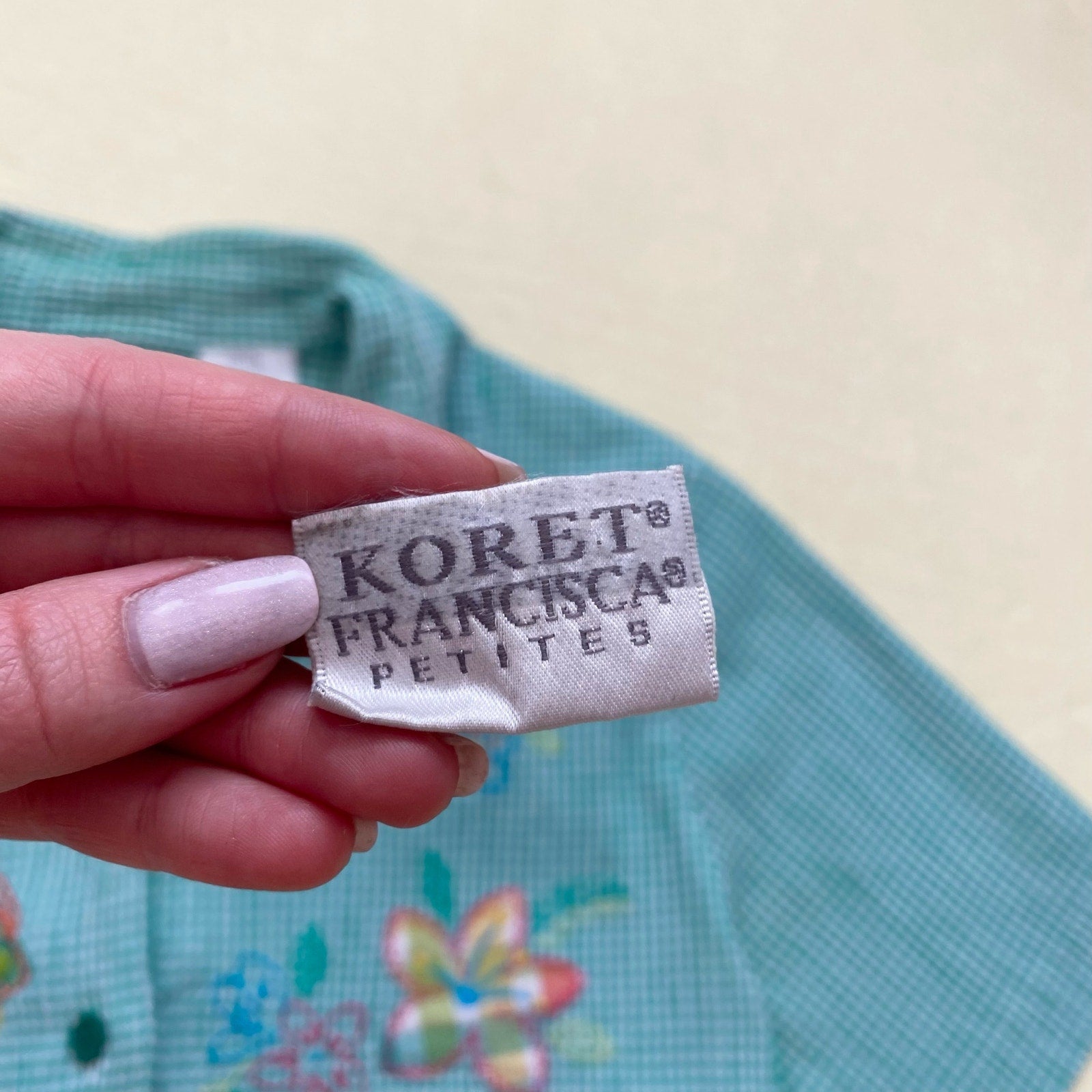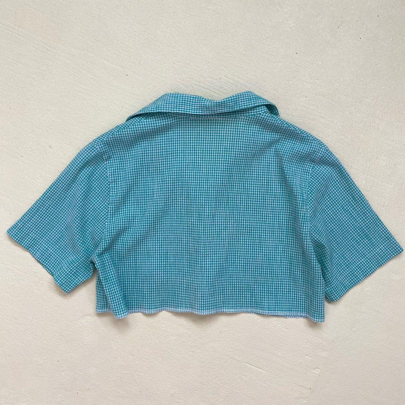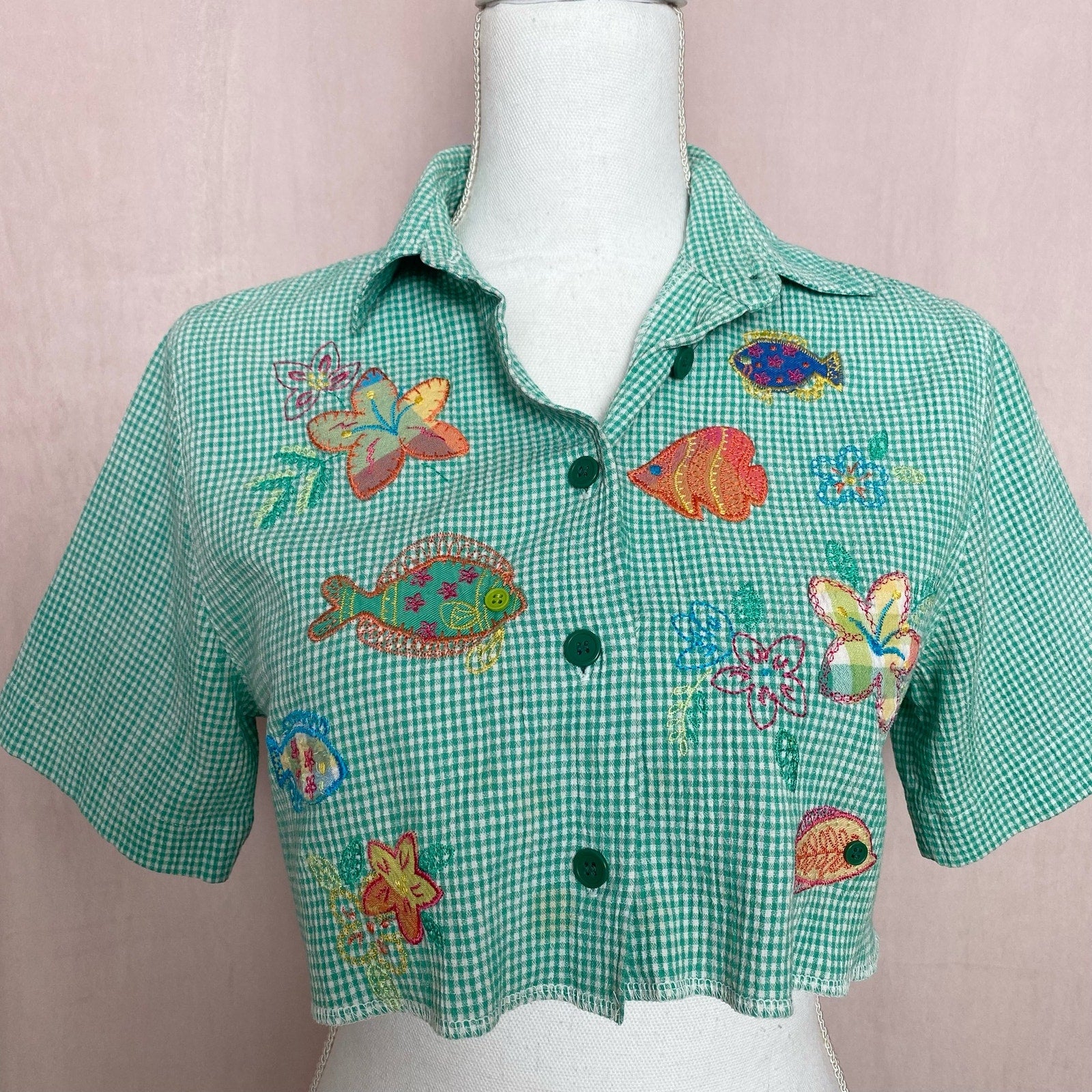upcycled vintage Koret Francisca checkered short sleeve button up collared crop shirt with tropical floral & fish embroidery & patchwork on front. lightweight woven cotton blend fabric. marked size P, shown on small - please see measurements!