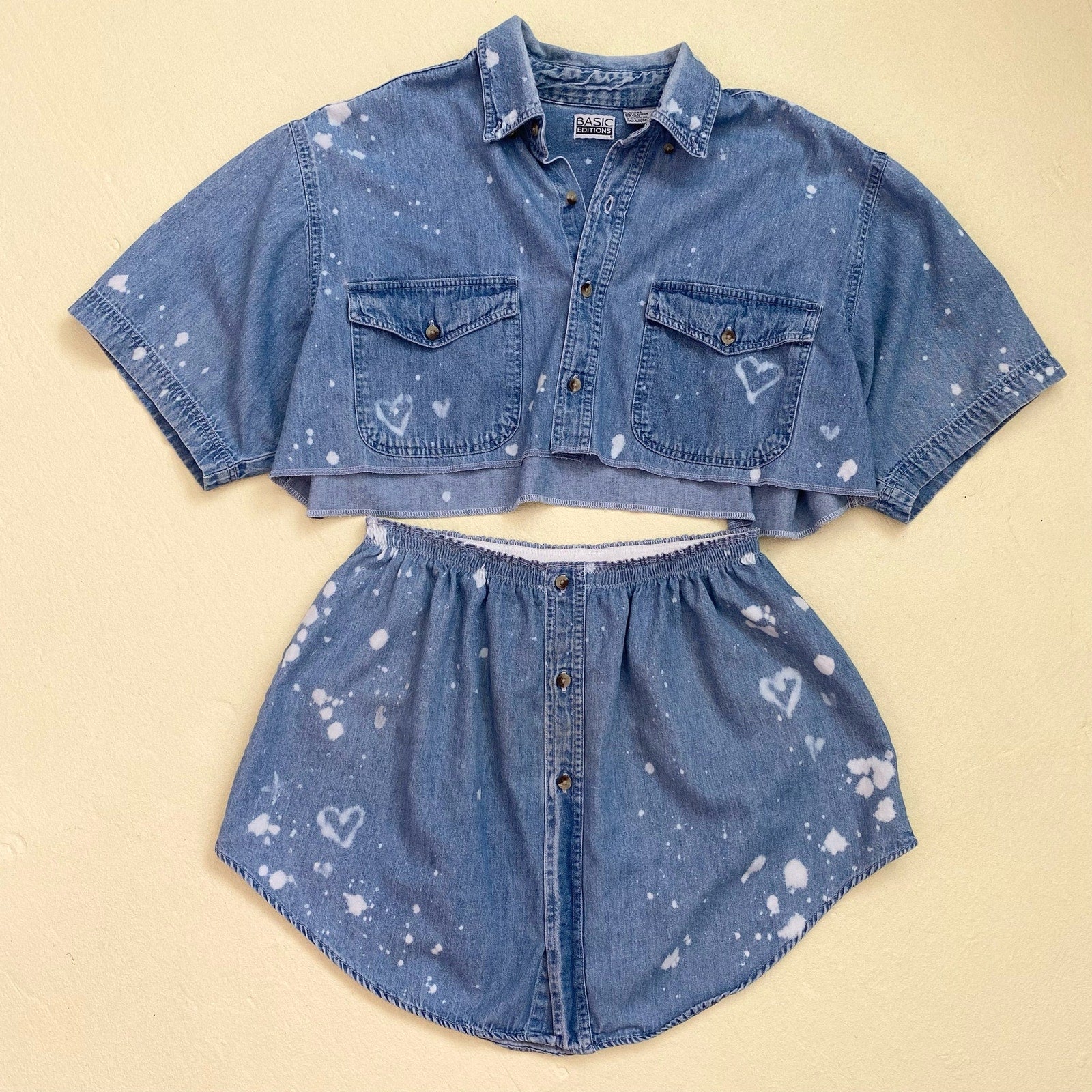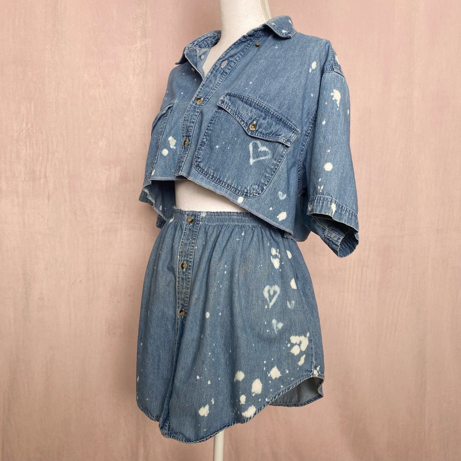 Upcycled Vintage Denim Bleach Heart Button Front Skirt Set, Size M/L