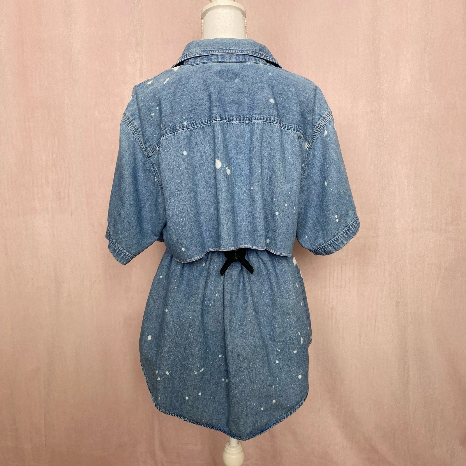 upcycled vintage Basic Editions soft blue cotton denim oversized short sleeve cropped collared button up top with front chest pockets & matching high waisted pull on button front A-line denim mini skirt two piece set. original piece marked size men’s L, set fits best medium-large with 27-32” skirt waist. please see measurements for best fit!
