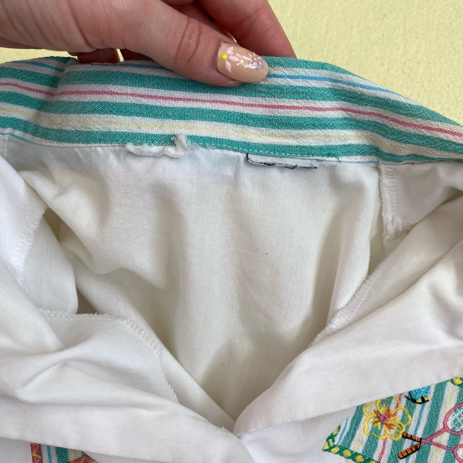short sleeve collared cropped button up shirt with tropical floral tennis bocce ball embroidery detail front & stripe trim. lightweight thin soft woven cotton. no marked size, can fit up to XL. please see measurements!