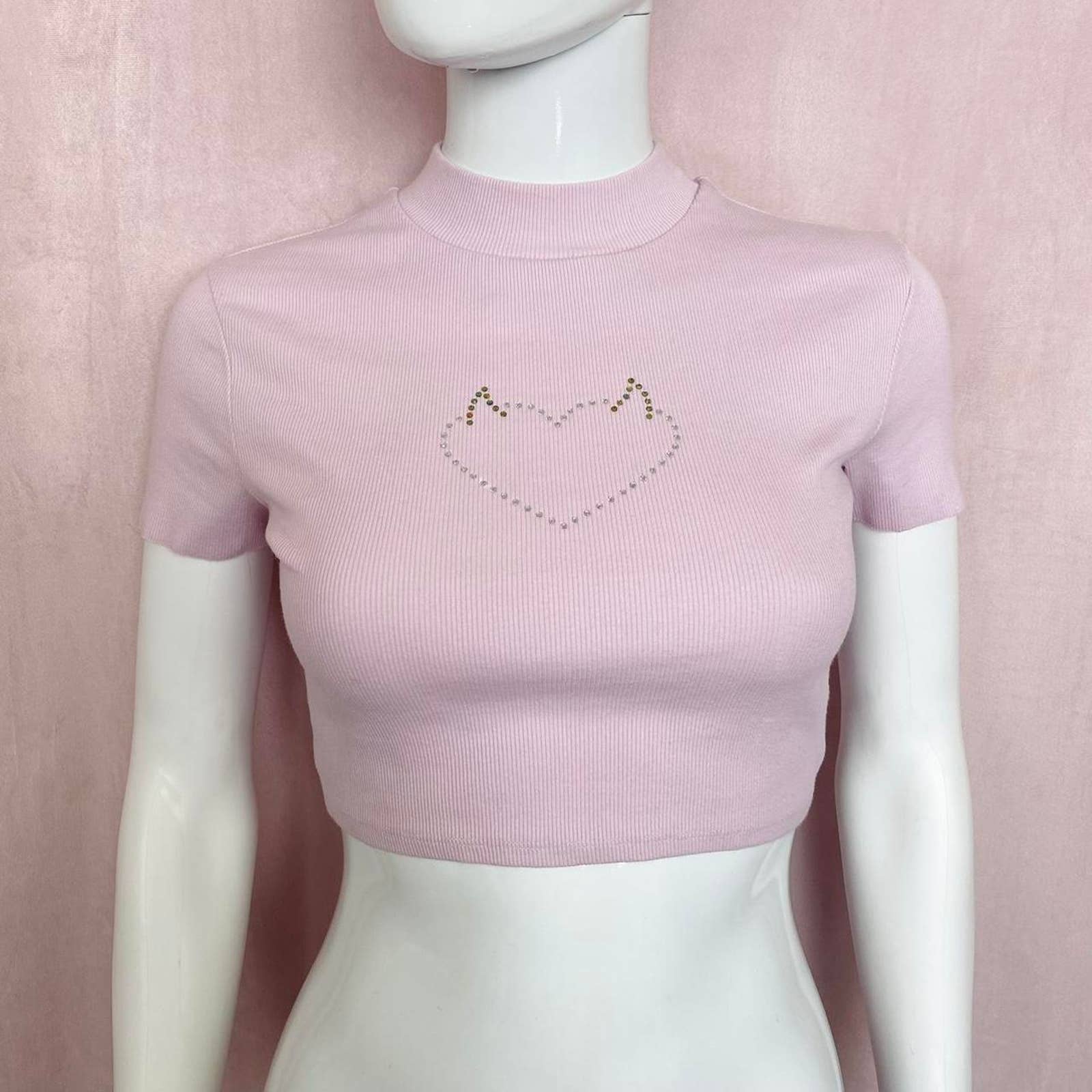 UO Me to We light pink short sleeve ribbed knit crop top t-shirt. sparkly gem studded heart with devil horns added to cover small white stain on front. loose hem cut sleeves & low turtle neck. stretchy soft material