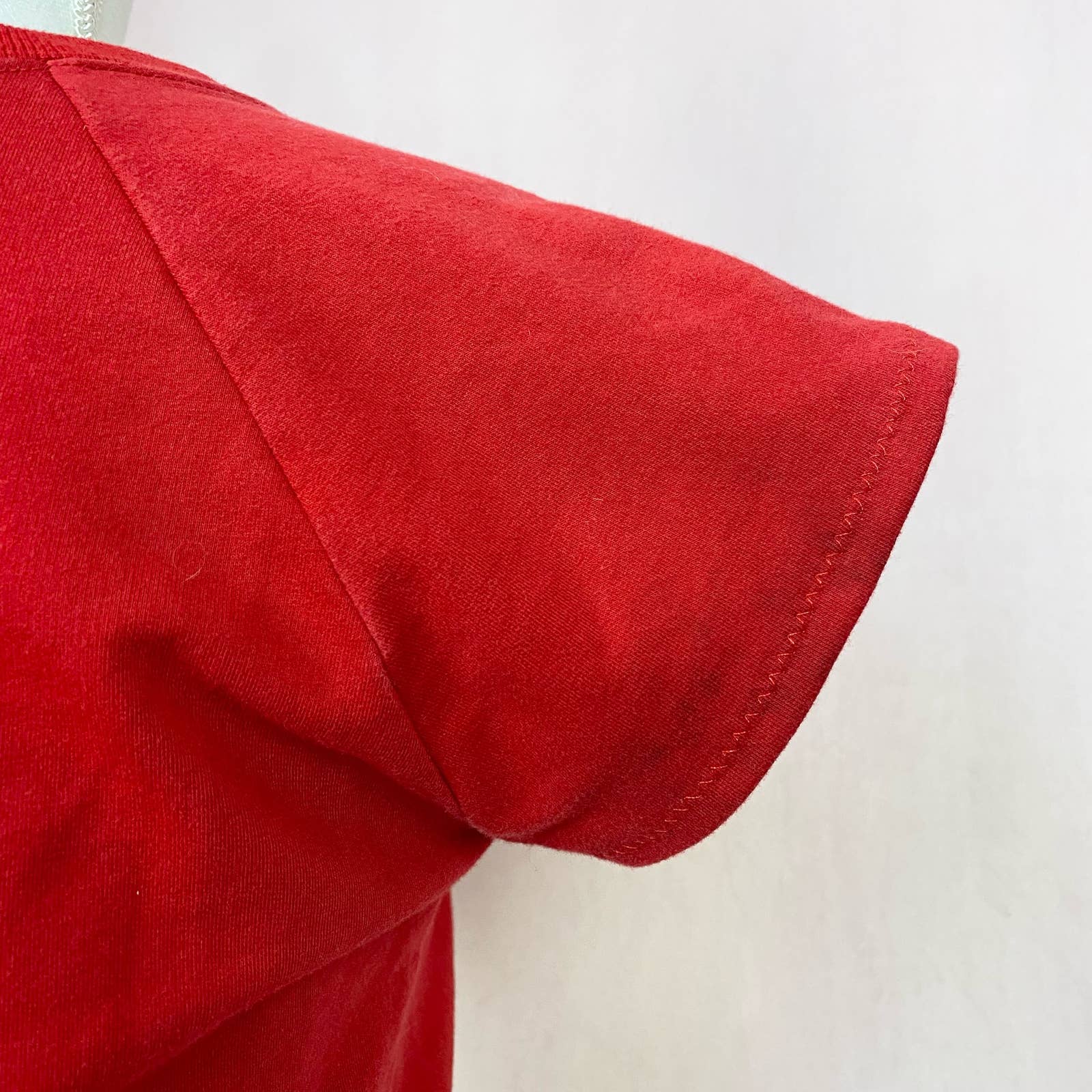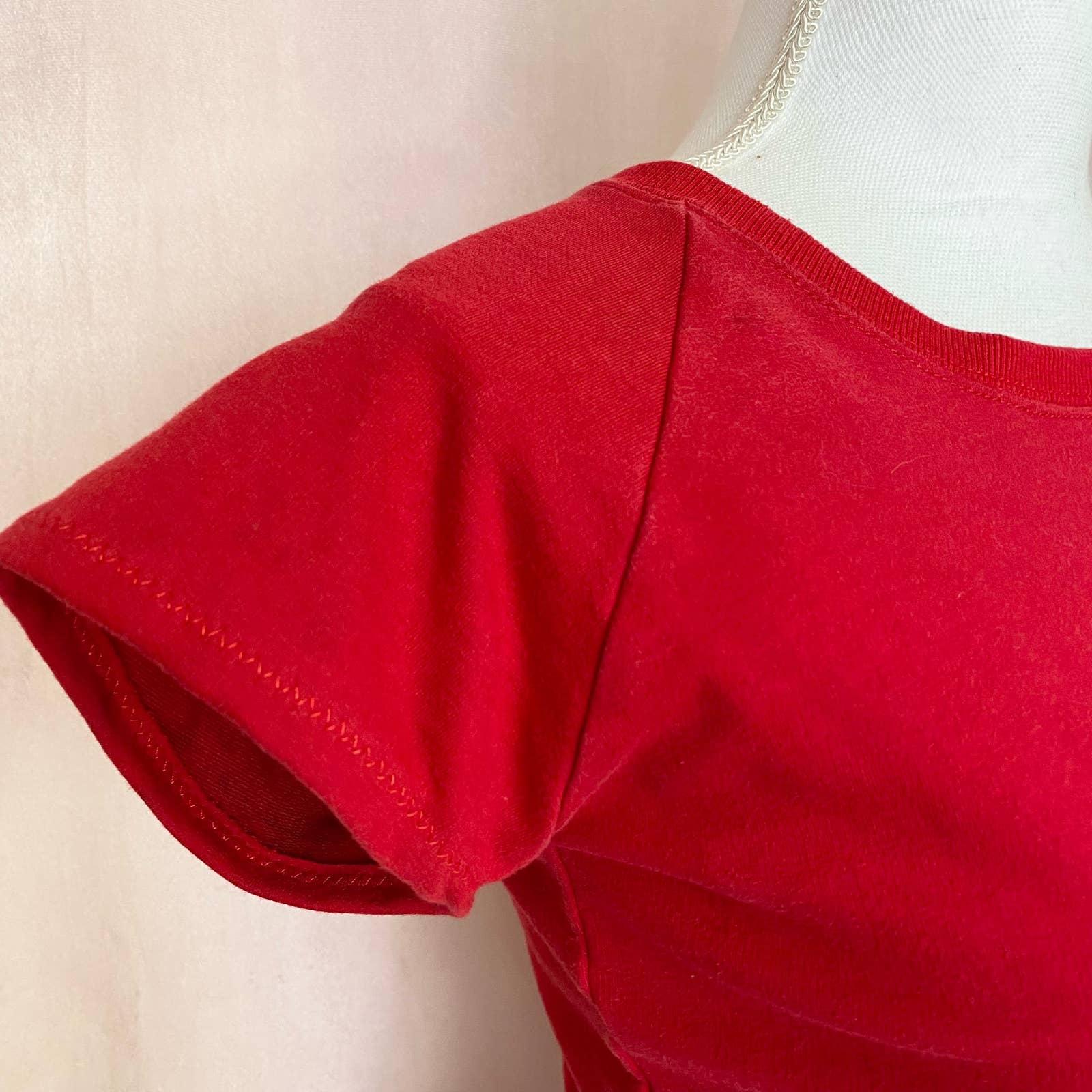 by Peter Jensen UO upcycled red short sleeve cropped sweater tee t-shirt with cinched in elastic 24”+ waist. gray embroidered elephant patch on front