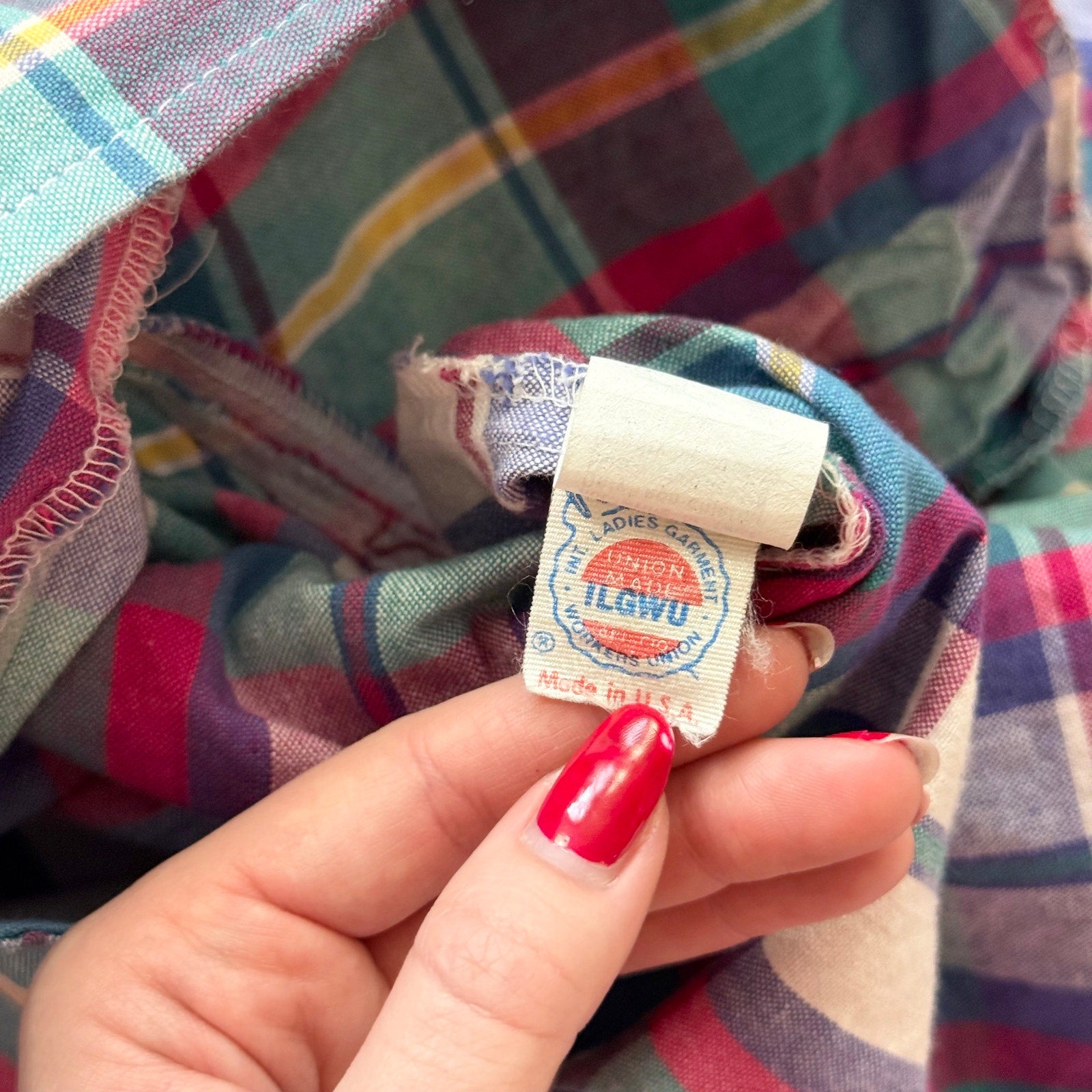 authentic vintage plaid blazer from the 1980s featuring a bright blue, green, pink, and yellow check pattern. made in the usa with an ilgwu union tag, single-button front, notched lapel collar, and long sleeves. lightweight and breathable — perfect for layering over tanks or dresses for a colorful preppy statement look.