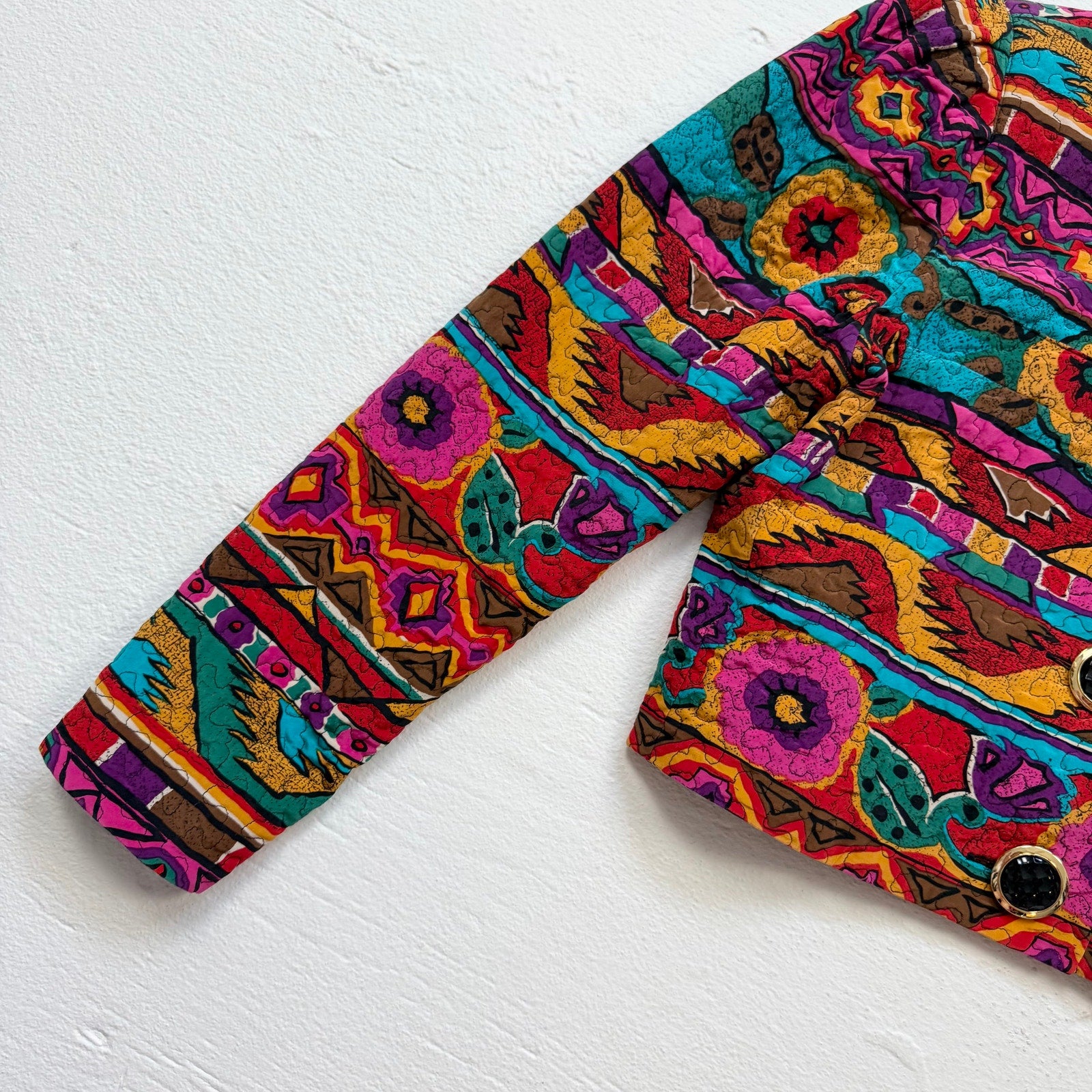 vibrant vintage 1980s quilted silk crop blazer by Rickie Freeman for Teri Jon featuring a bold abstract floral pattern in jewel tones of red, pink, turquoise, purple, and gold. made from 100% silk with statement buttons, structured padded shoulders, and a fully lined interior. eye-catching and luxurious — perfect styled over high-waisted trousers or a slip dress. best fits size small-medium based on measurements.