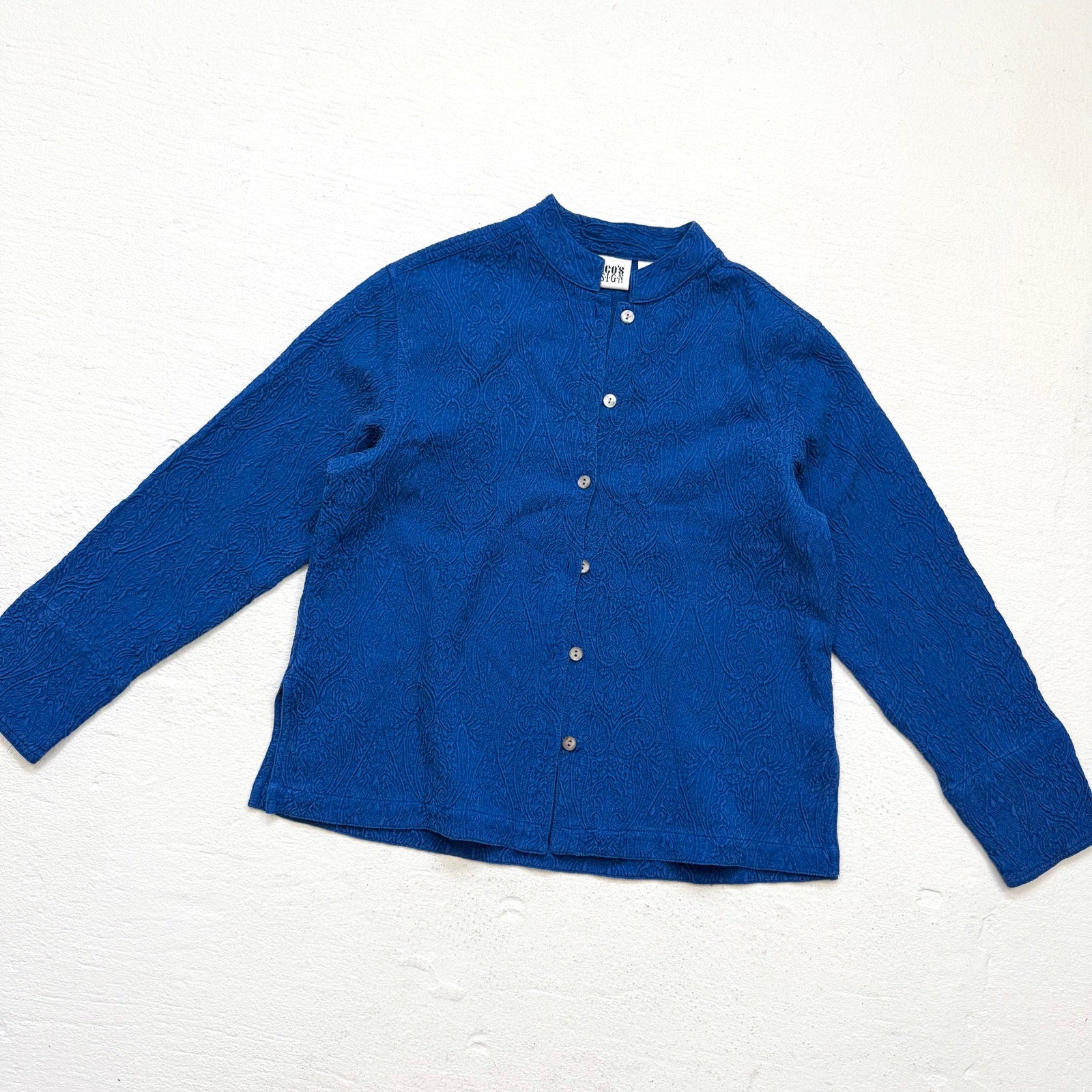 Vintage 90s Chico’s Design silk wool jacquard button-up in rich cobalt blue. Features a textured pattern, mandarin collar, and side bottom slits for ease of movement. Elegant yet versatile, perfect for layering or wearing on its own.