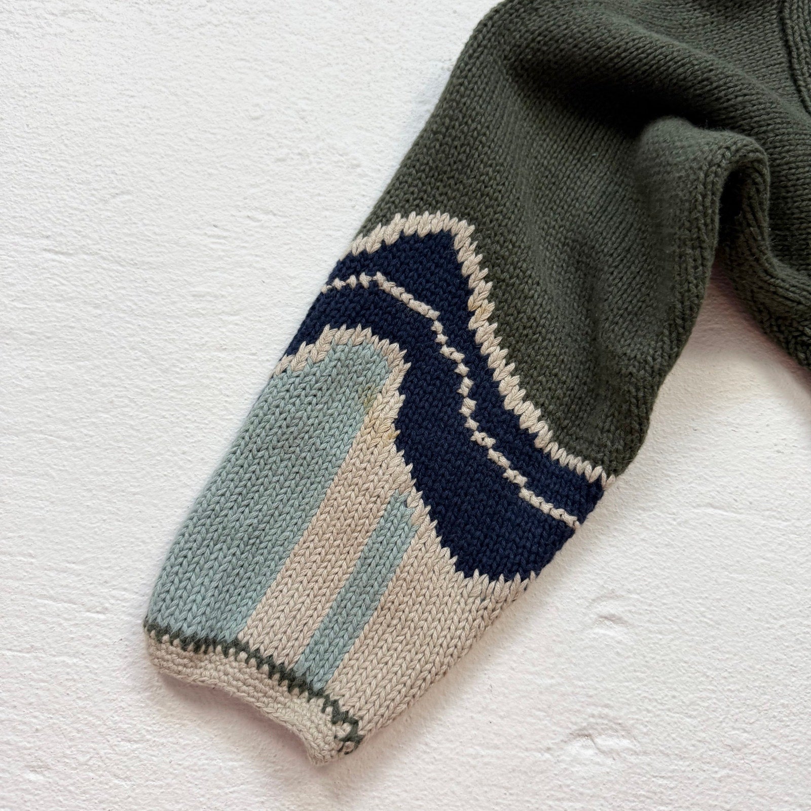 Vintage 1990s Christopher & Banks cardigan with a bold abstract knit in olive green, navy, tan, and blue tones. Chunky cotton-ramie blend with wooden-style buttons and a relaxed vintage fit. Made in Hong Kong and assembled in China, consistent with early 90s knitwear production. Perfect statement sweater for layering or adding a cozy retro touch.