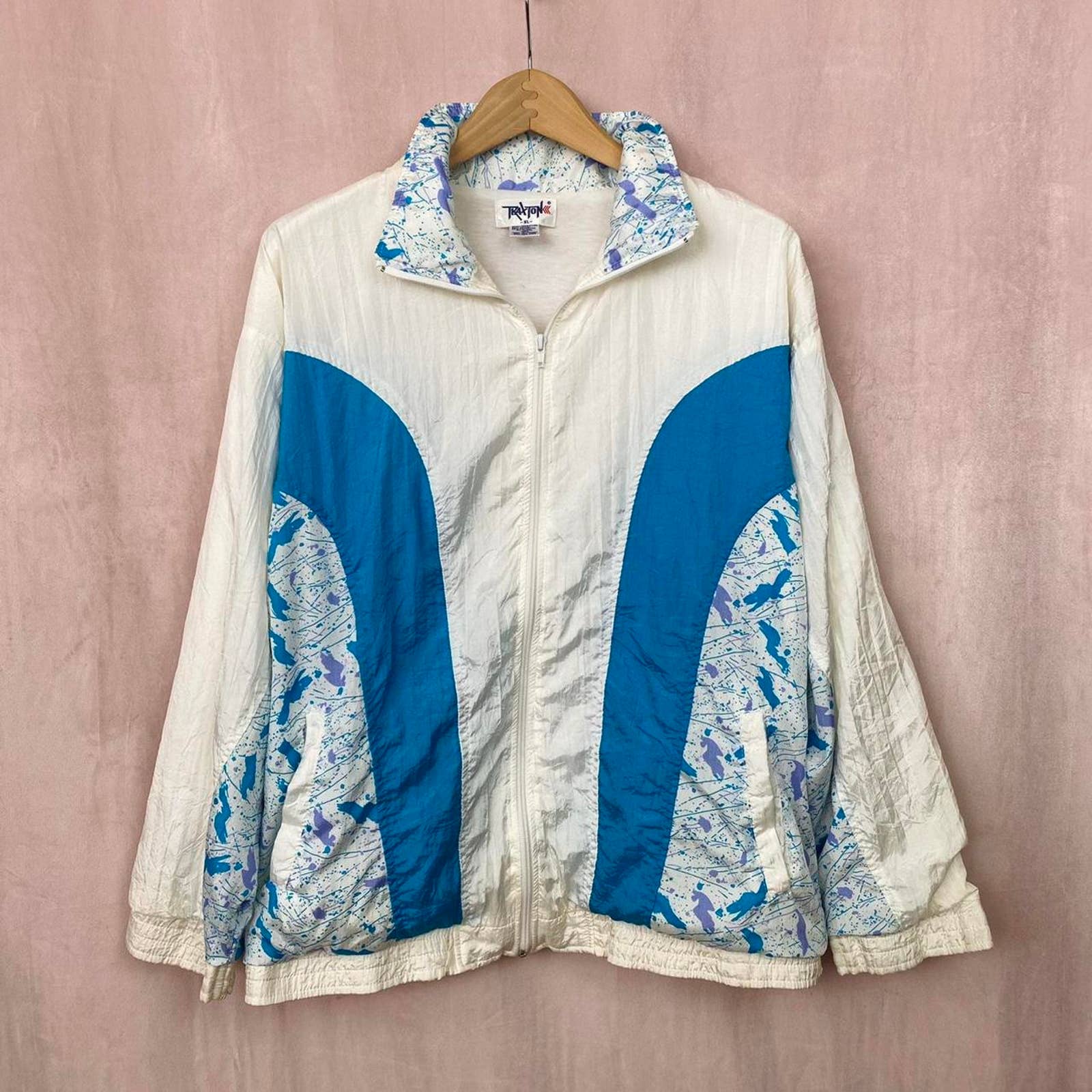 ❀ nylon 1990s era retro long sleeve zip up jacket, teal blue purple splatter pattern on cream white