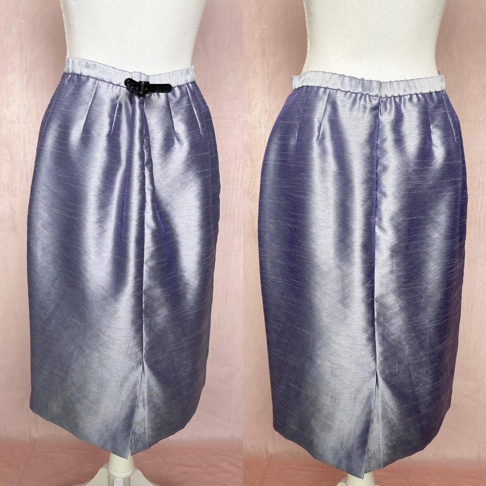skirt: high rise knee length straight pencil skirt, hidden back zip closure with hook & eye closure, lined, back bottom slit, *pinned in back in pics to show fit