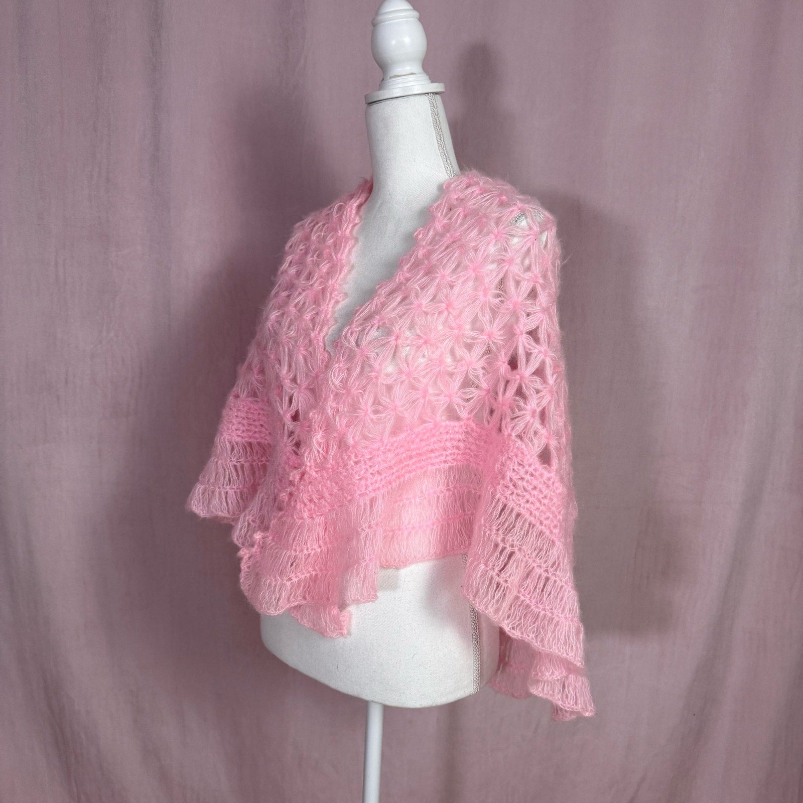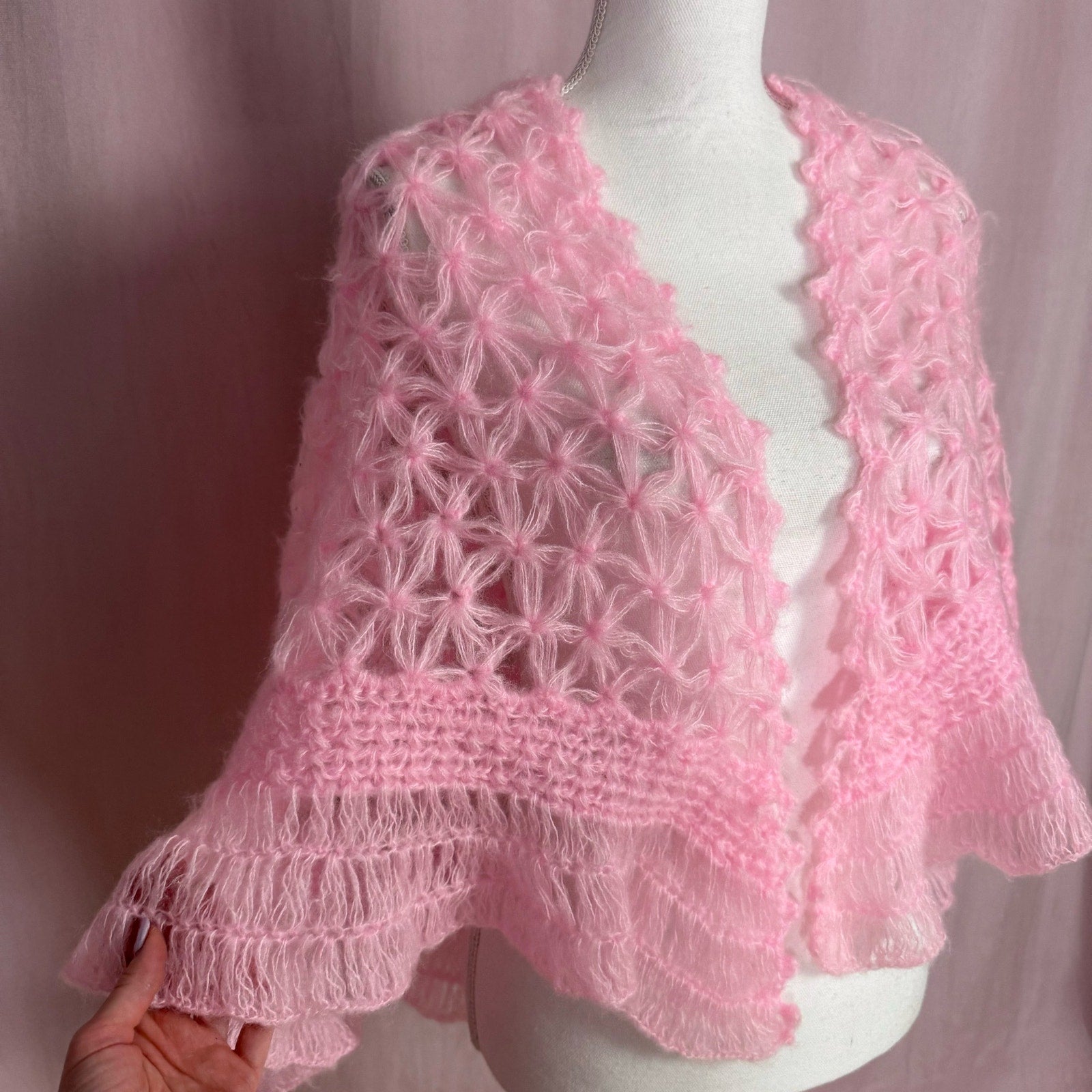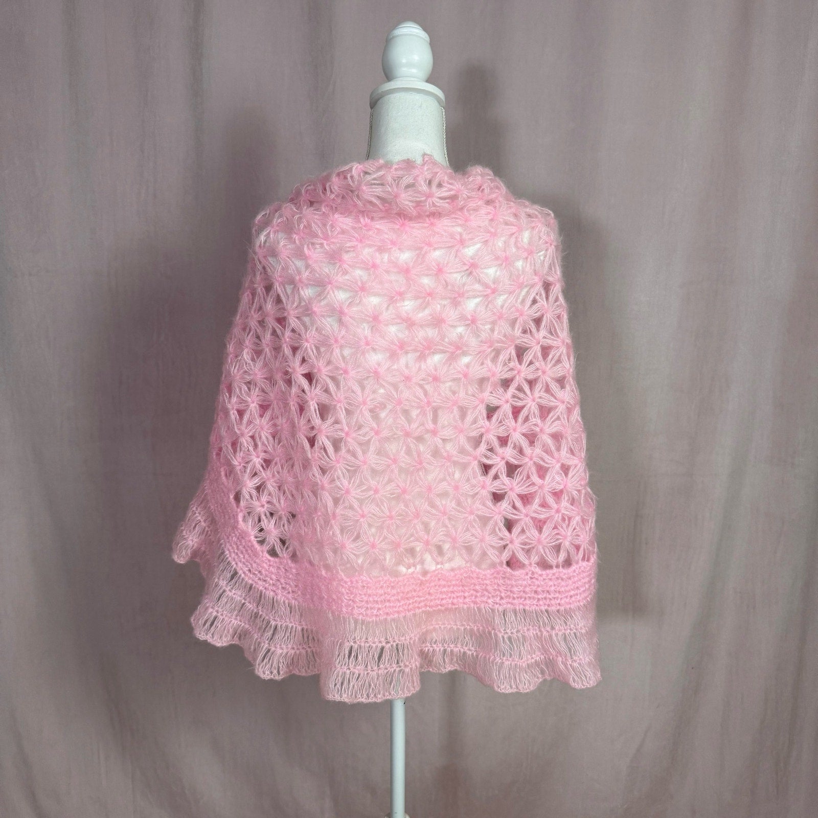 vintage hand crochet knit light pink 100% acrylic open knit shawl. open knit floral pattern