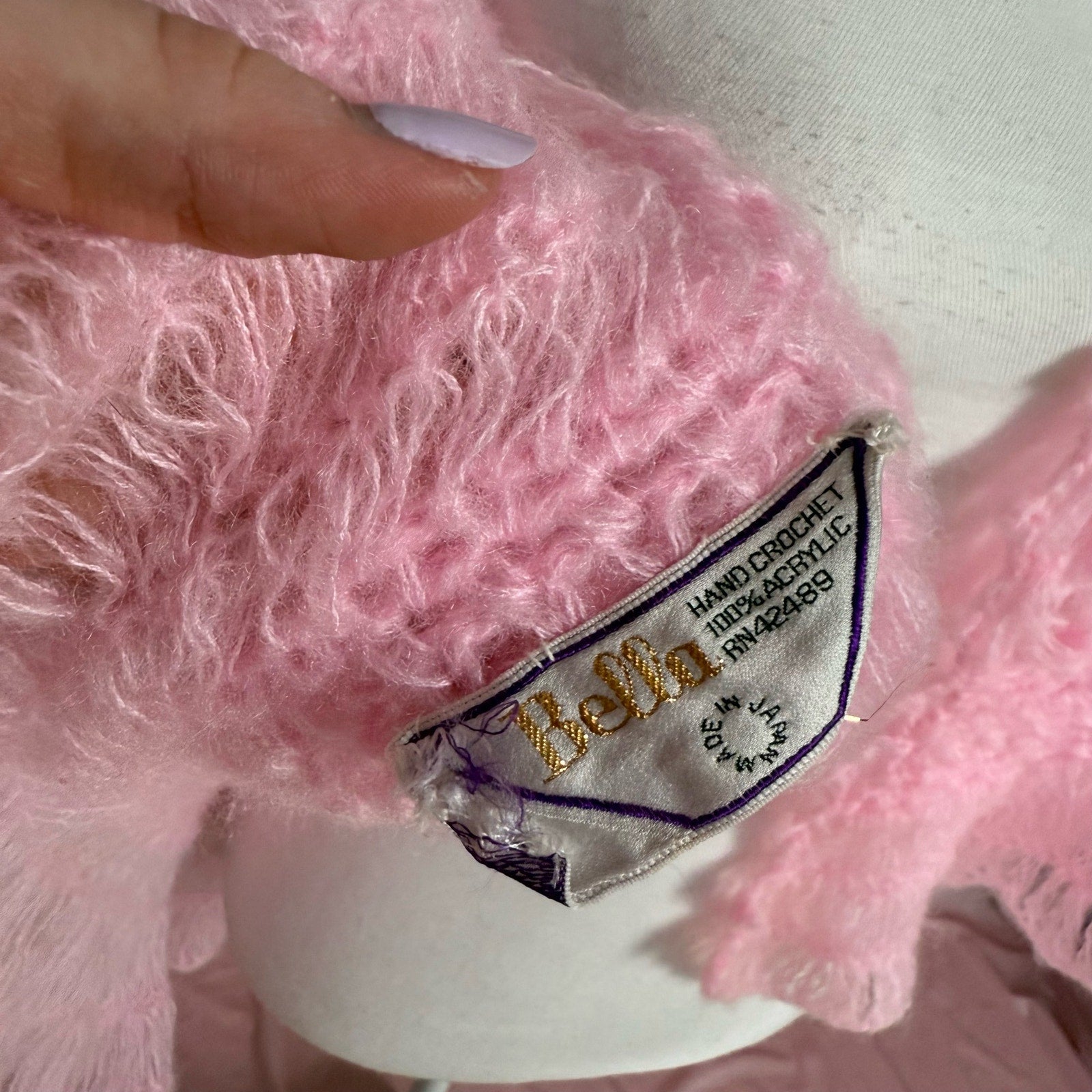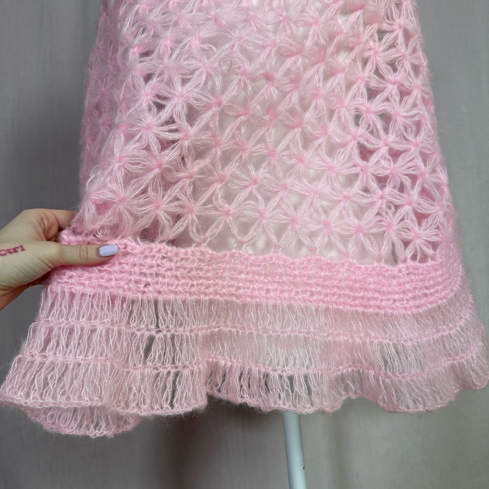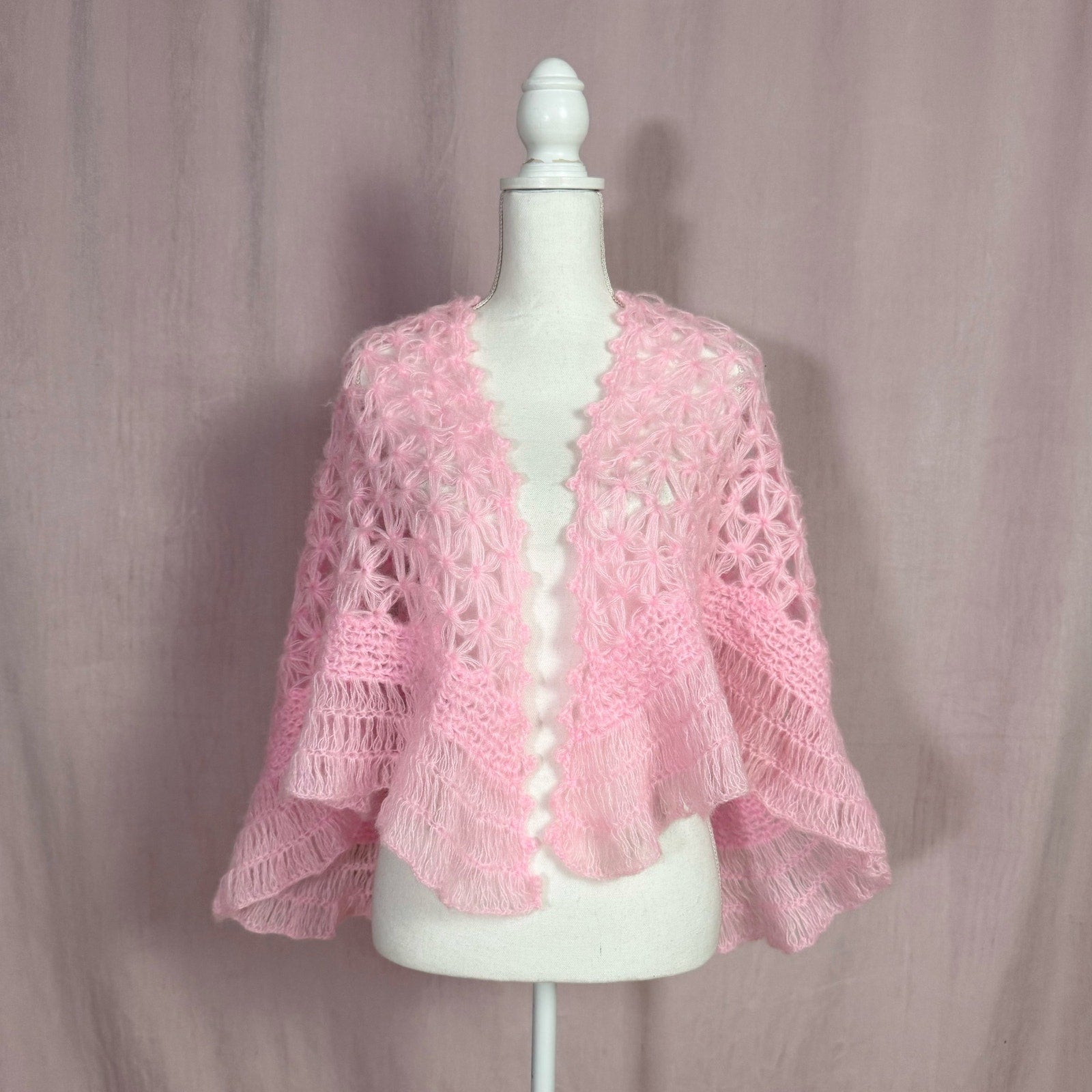 vintage hand crochet knit light pink 100% acrylic open knit shawl. open knit floral pattern