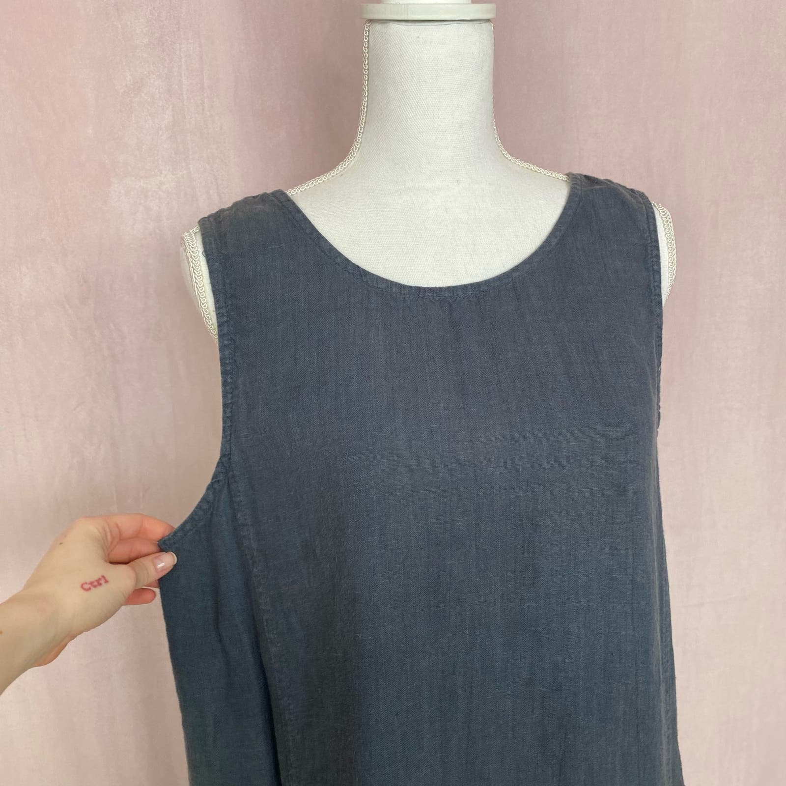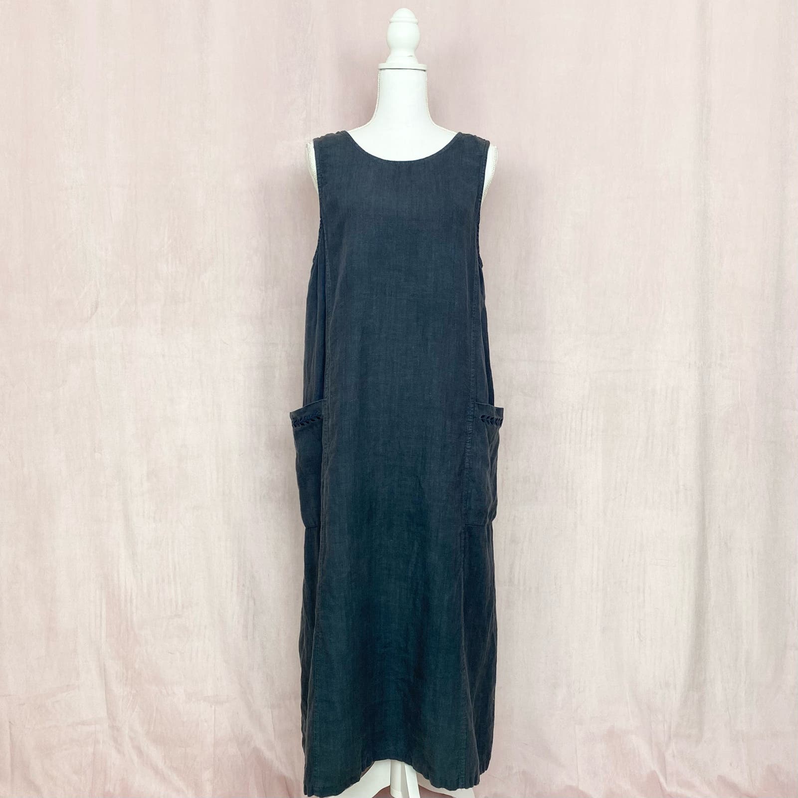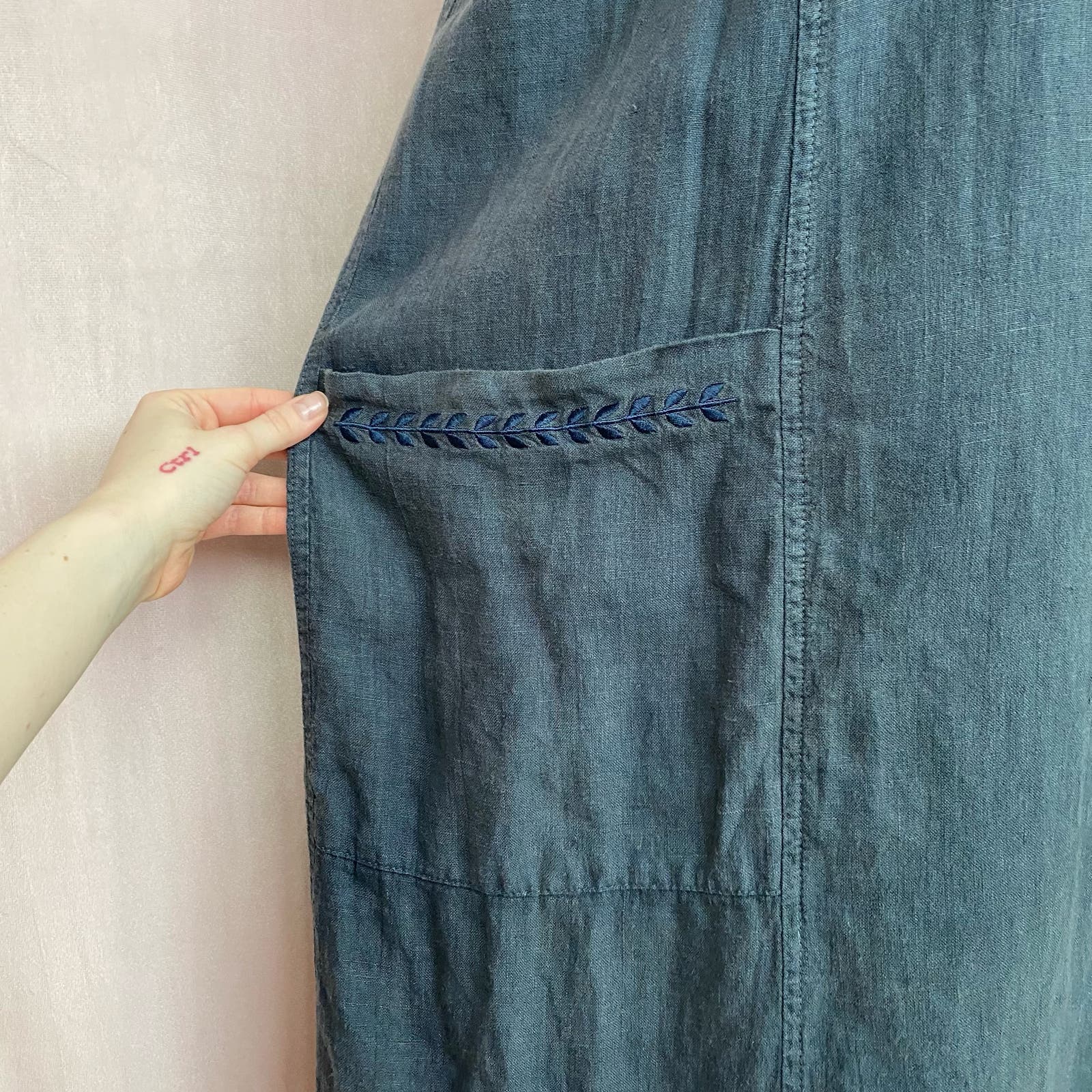 vintage gray linen minimalist A-line long midi dress with leave embroidered large side pockets. oversized relaxed fit. flowy linen fabric. unlined