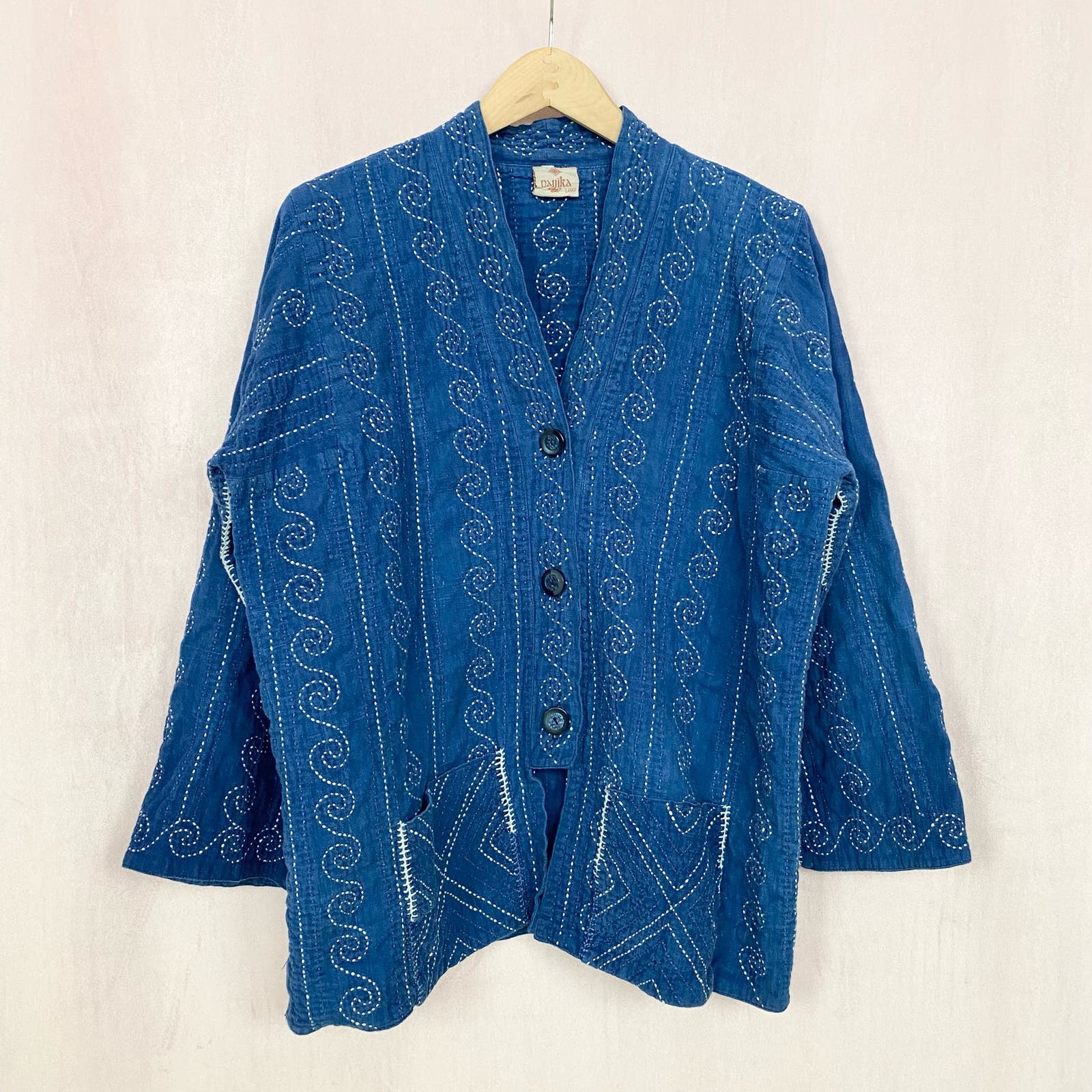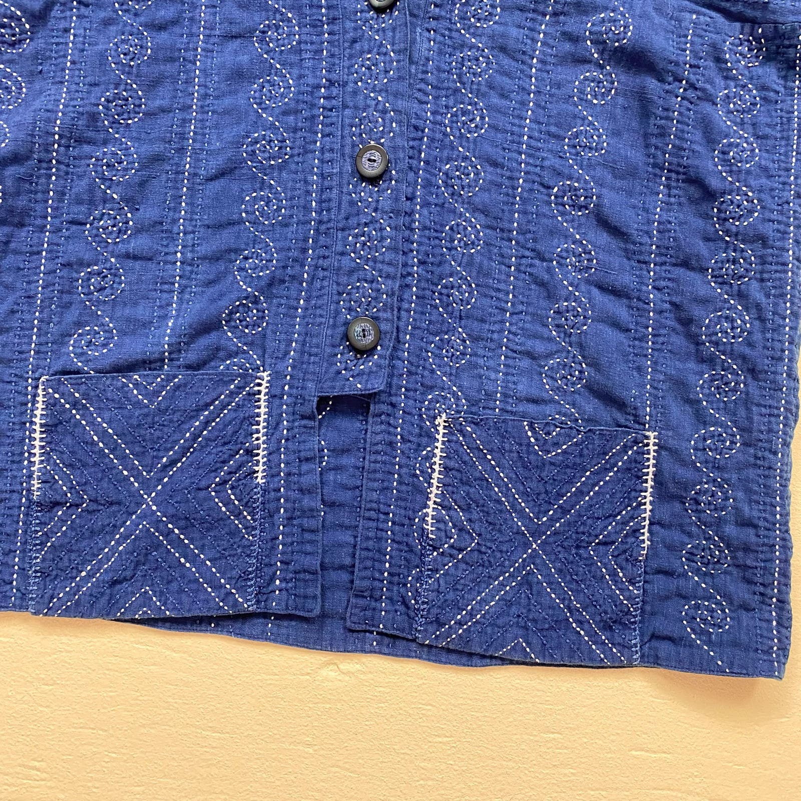 vintage nayika oversized blue cotton denim button up jacket long sleeve shirt with front patch pockets & cream white swirl stripe embroidery pattern. beautiful marble detail buttons