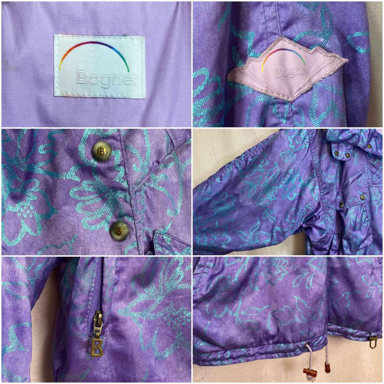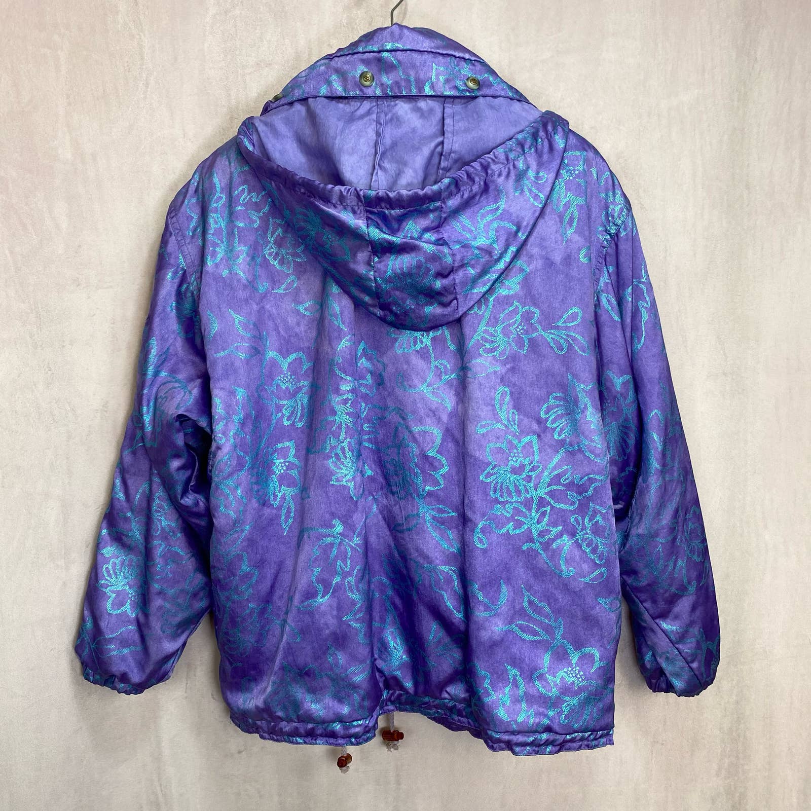 80’s era rare luxury sportswear zip up winter ski jacket with hood that can fold into collar. no size, measures 25” pit to pit & 27” length, around 3XL women’s. violet purple with metallic teal blue floral embroidery pattern. adjustable waist with drawstrings. front waist zip up pockets & snap button chest pockets. incredible detail & features shown in pictures. nylon like material. *see condition below for wear info