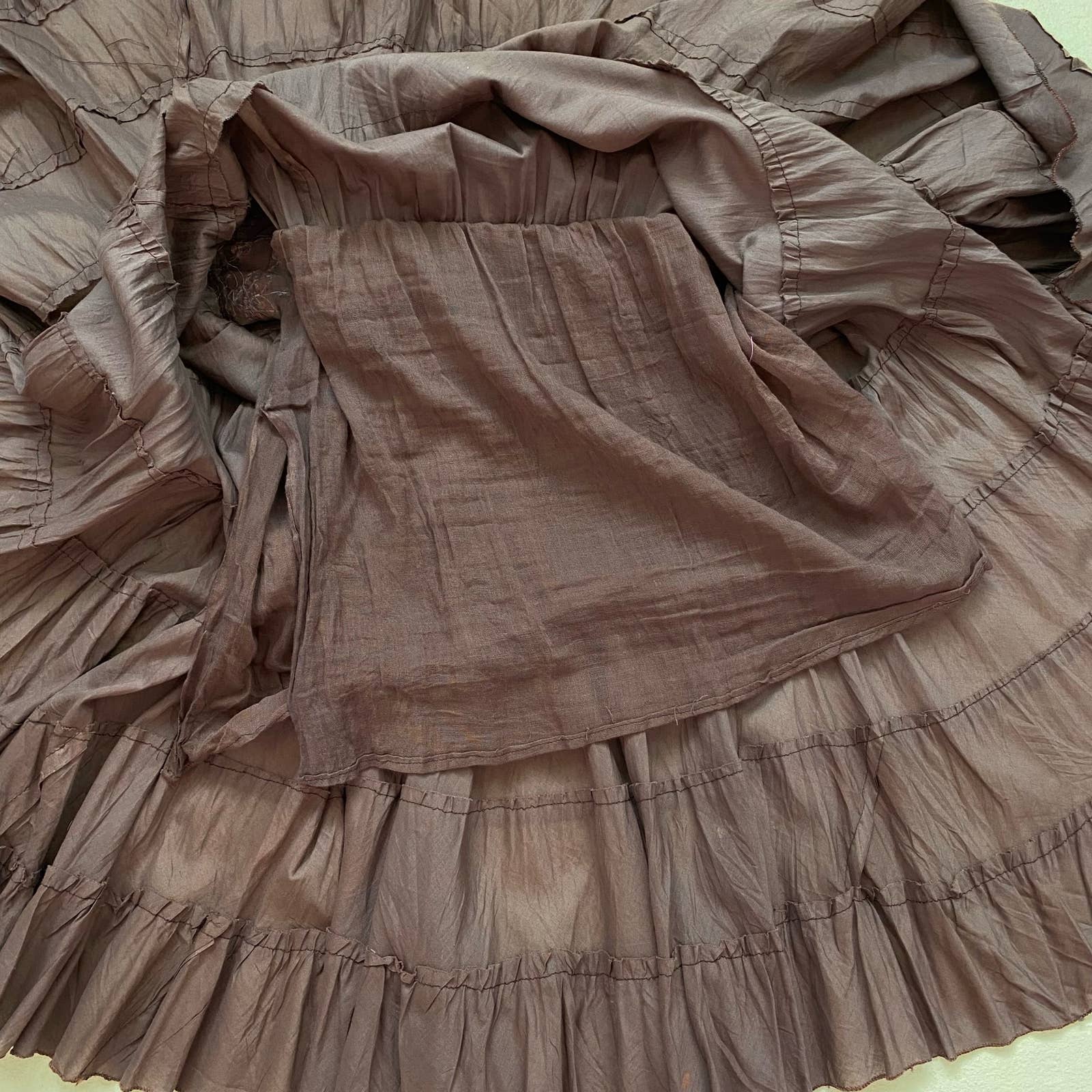 handmade brown midi A-line cottage grunge fairy ruffle tiered skirt with embellished brown sparkly sequins & beads on front waist. elastic drawstring tie waist. inside mini skirt lining. very thin lightweight fabric, lightly see through. no marked size but fits best medium-large with 30” waist