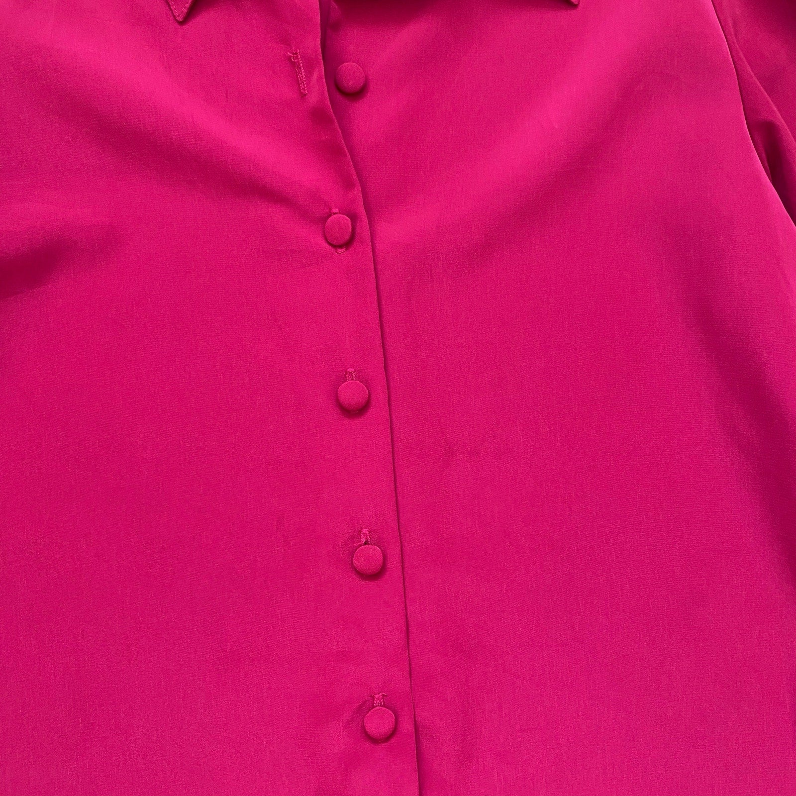 vintage satin flowy cropped cuffed sleeve collared button up shirt. thin lightweight flowy fabric. relaxed fit. marked size medium petite. fits large / oversized - please see measurements!