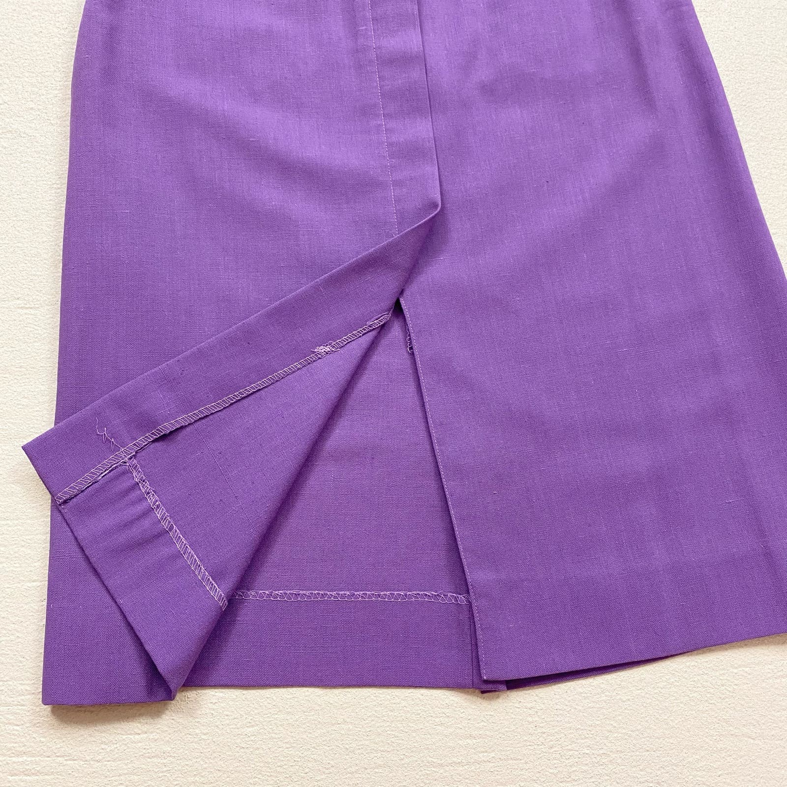 vintage 60s A-line high waisted knee length midi cotton rayon blend skirt with matching belt, open pockets, front slit, pleated detail. backside hidden top zip button closure. marked vintage size 7/8, fits XS with 24" waist. part of material not shown on tag but believe it is a cotton / rayon blend. unlined