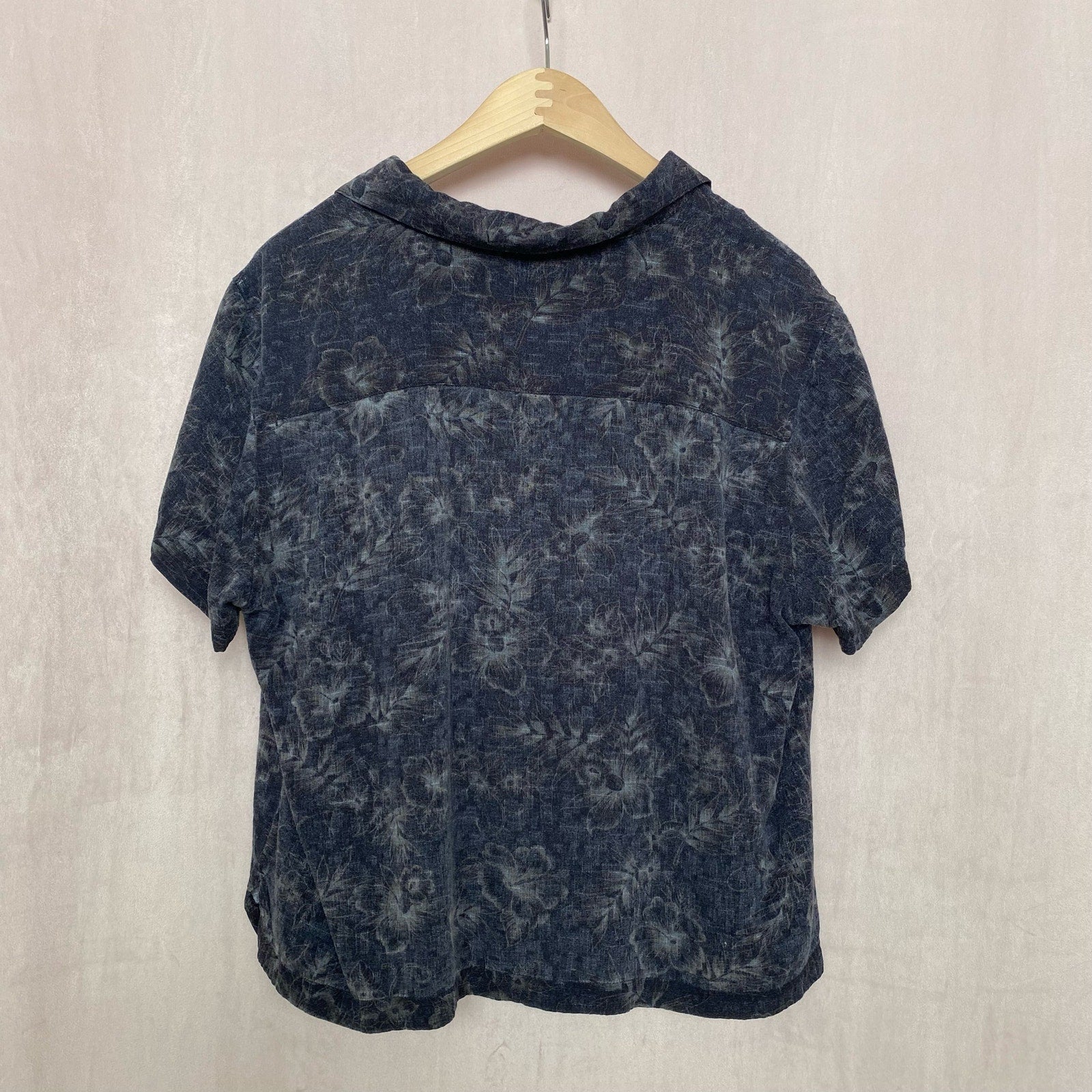 vintage tropical floral charcoal black gray collared short sleeve button down aloha shirt made of heavy soft flowy rayon fabric. wooden button detail. relaxed boxy fit