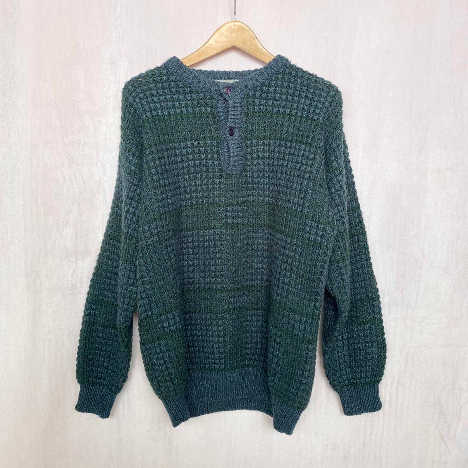 vintage Big Fashion Co oversized waffle knit sweater with 1/4 button front. thick soft fabric. loosely knit, lightly see through. green navy blue colors. faint stripe checker pattern