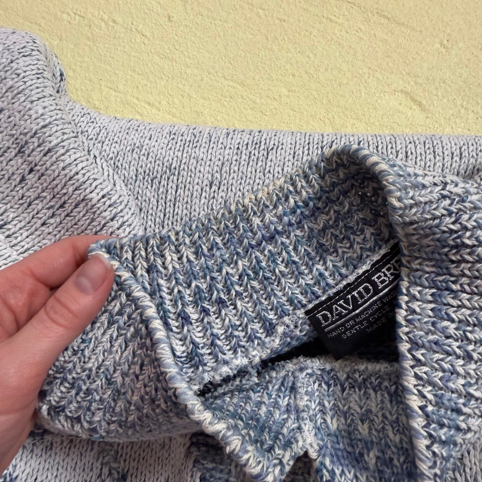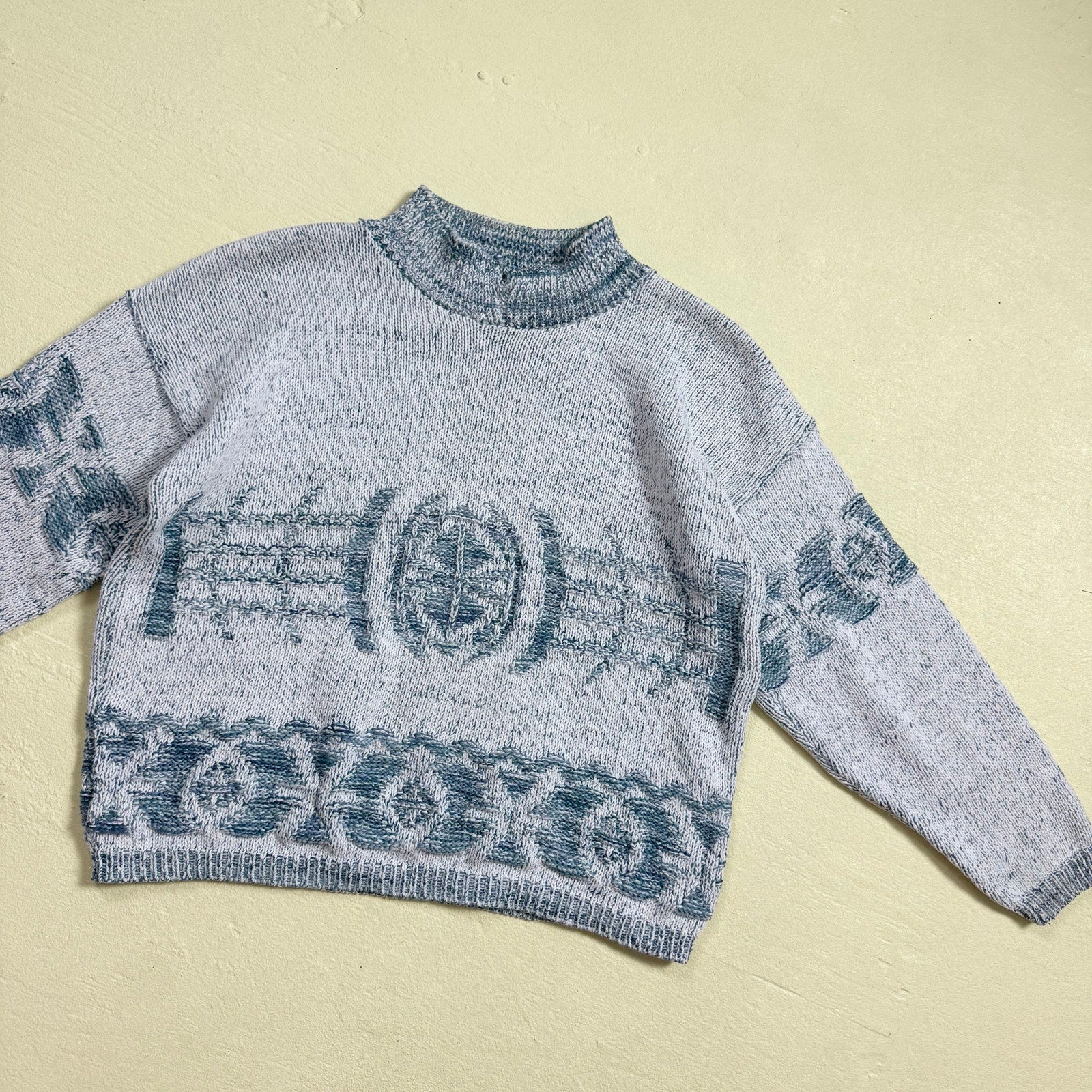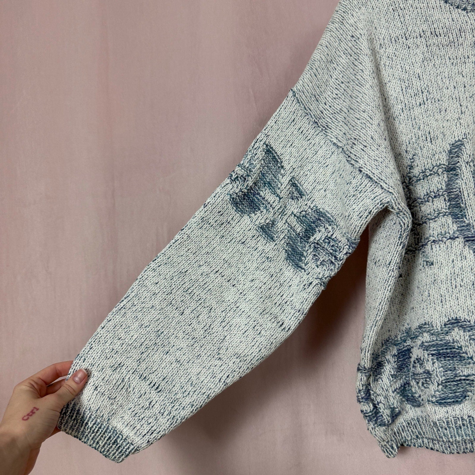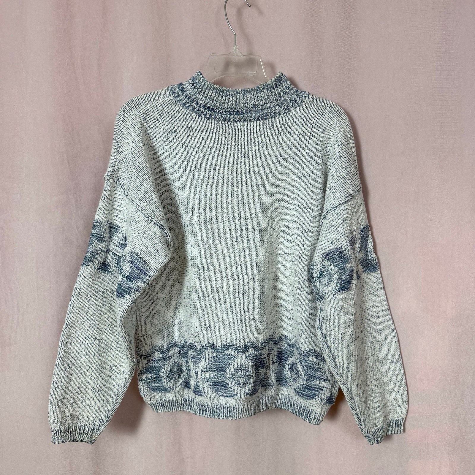 vintage chunky knit light blue/navy sweater. thick heavy knit stretchy fabric. no size, fits relaxed/oversized - please see measurements for best fit!