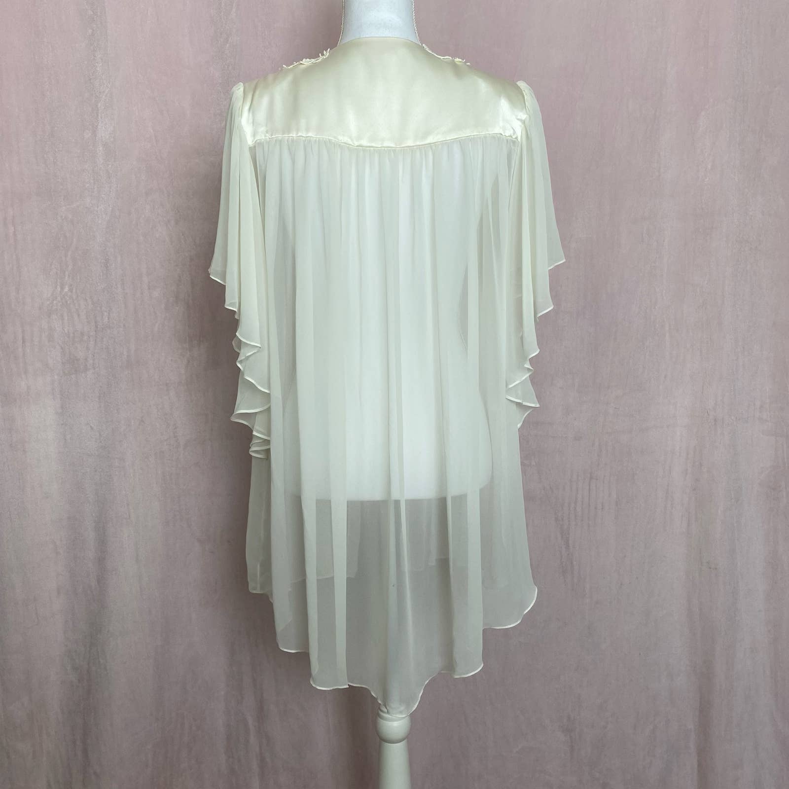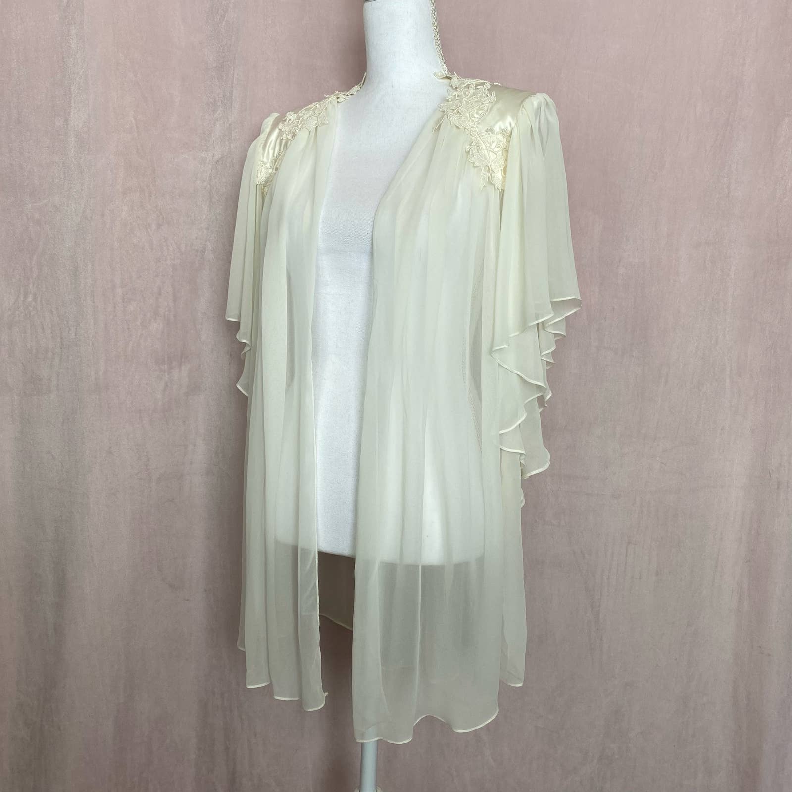 saks fifth avenue cream white butterfly sleeve mesh nightgown robe with open front. flowy lightweight sheer material with lace trim around neckline & satin padded shoulders