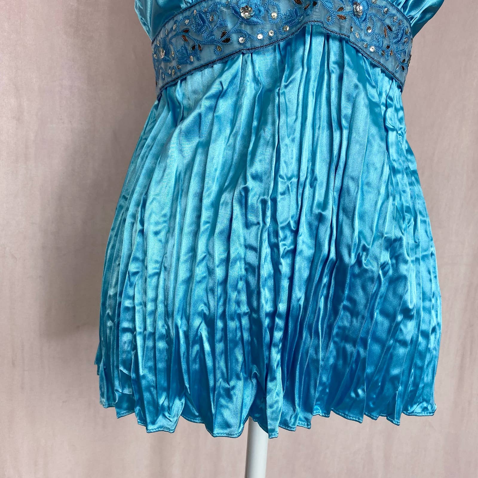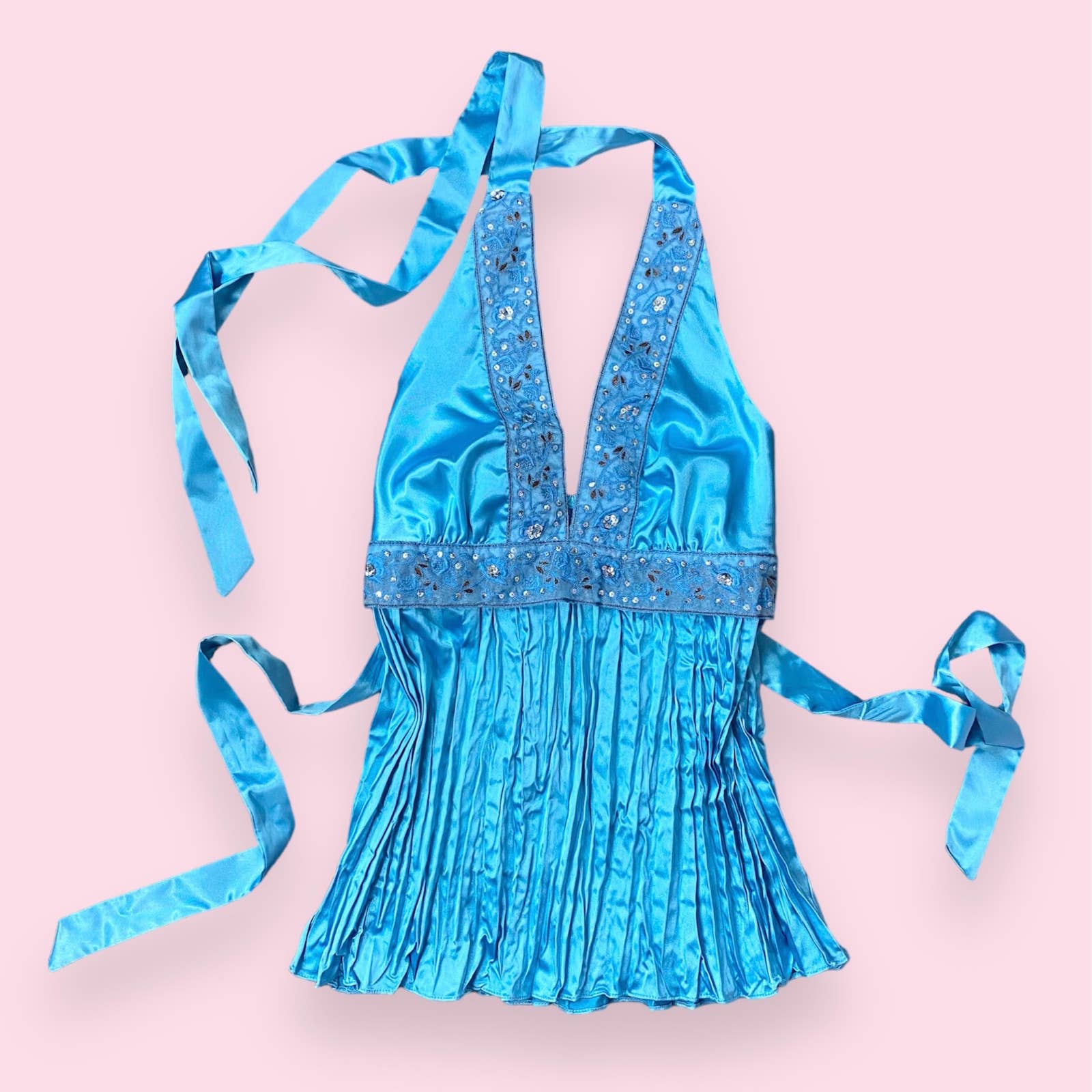 blue satin halter tie camisole with embellished sequins floral metallic trim plunge v-neck & waistline. waist tie & elastic back of waist. pleated silhouette
