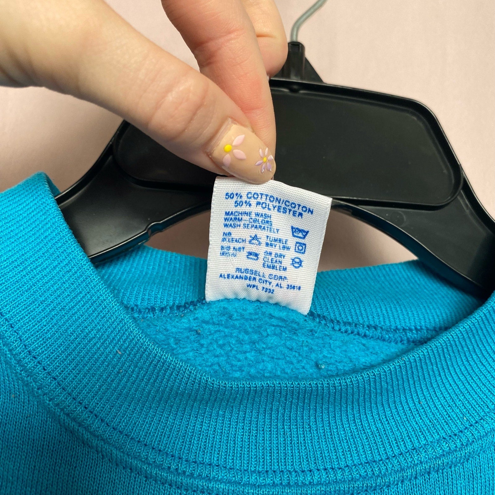 vintage Jerzees teal blue handmade embroidered "everything in life depends on just what happens in the end" crewneck sweatshirt. marked M, but would say this fits best XS-small if wanting relaxed fit