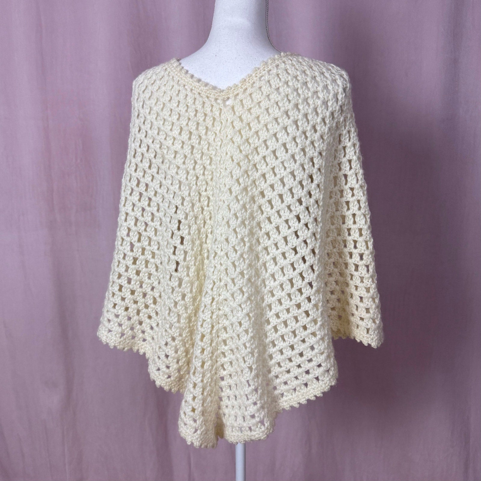 Vintage Handmade Cream Crochet Knit Poncho, One Size