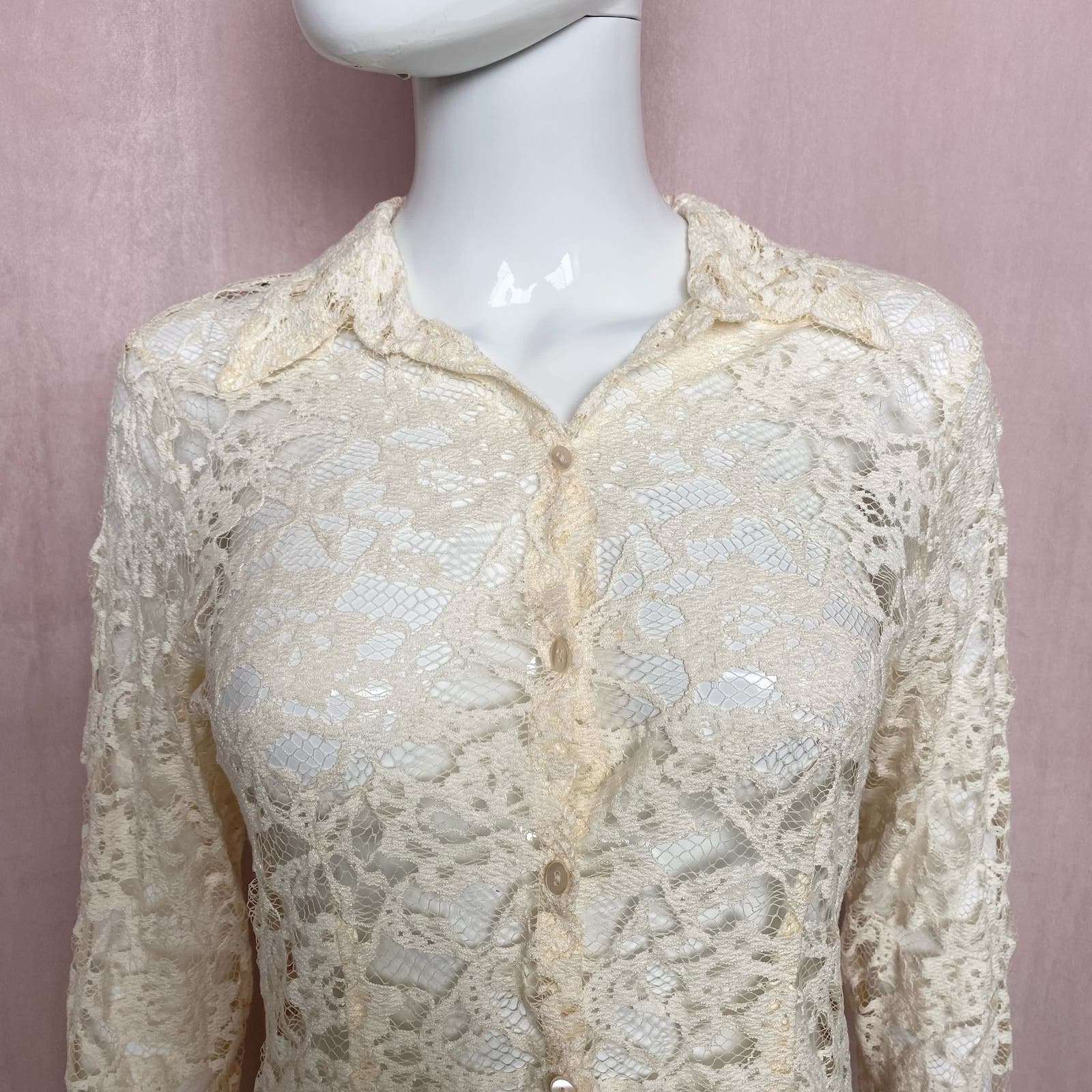 vintage ICE open cream lace crochet embroidered button up long sleeve collared top blouse. scallop hem. oval button detail. see through. lightweight soft dainty fabric. relaxed fitted style