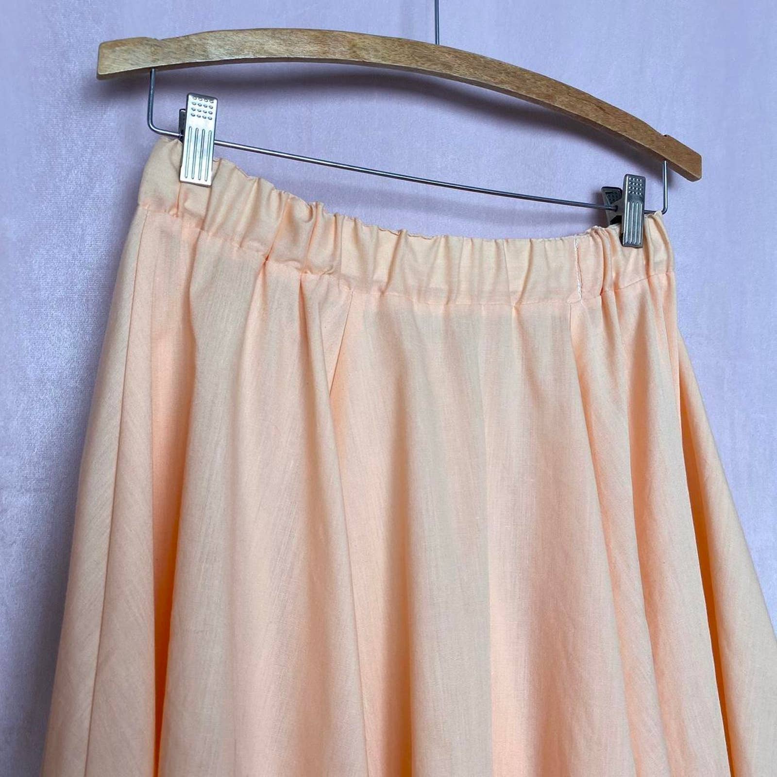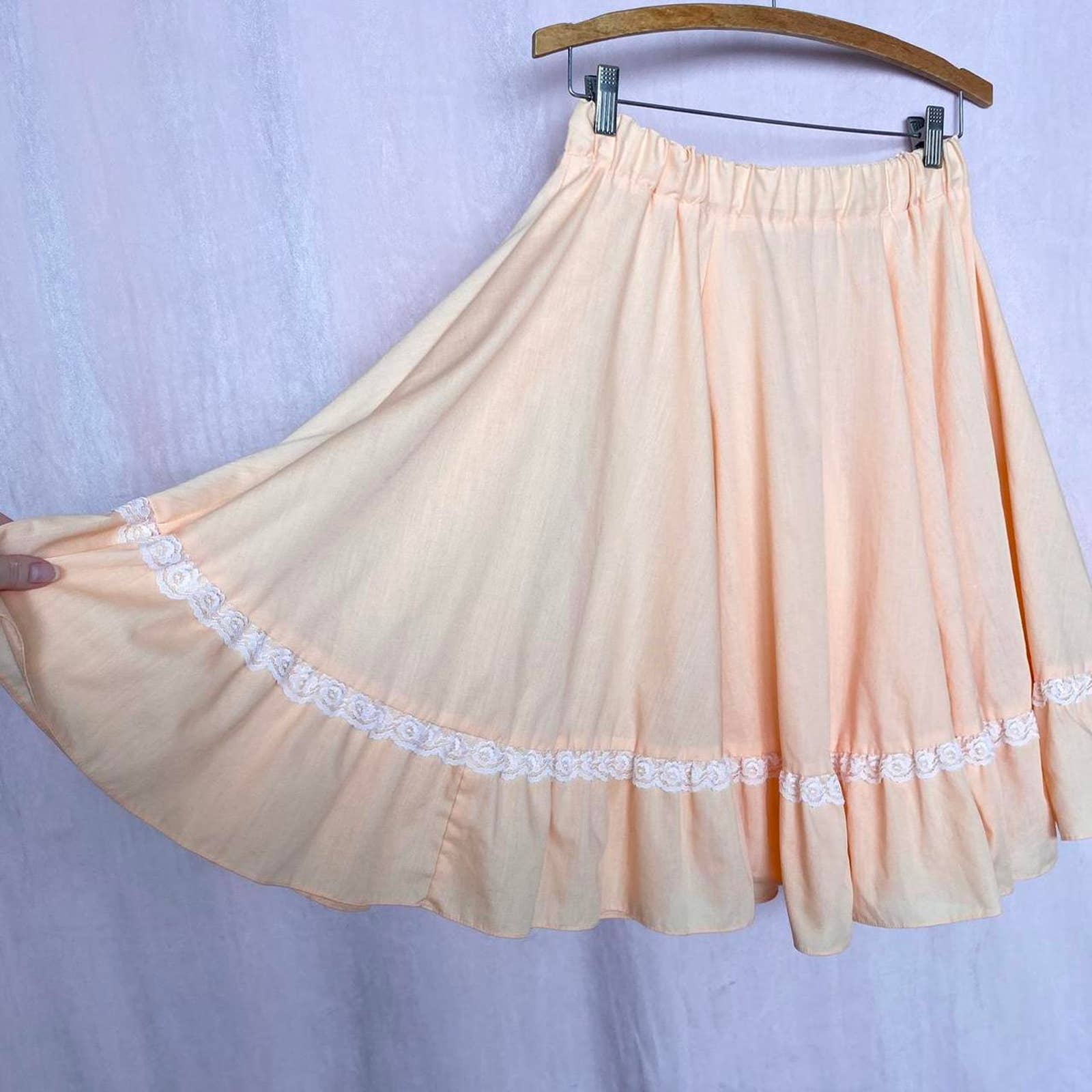 vintage 60’s peach A-line high waisted ruffle hem midi swing skirt with white lace trim. elastic 27” waist. midi. woven thin lightweight fabric, lightly see through. *repaired elastic band