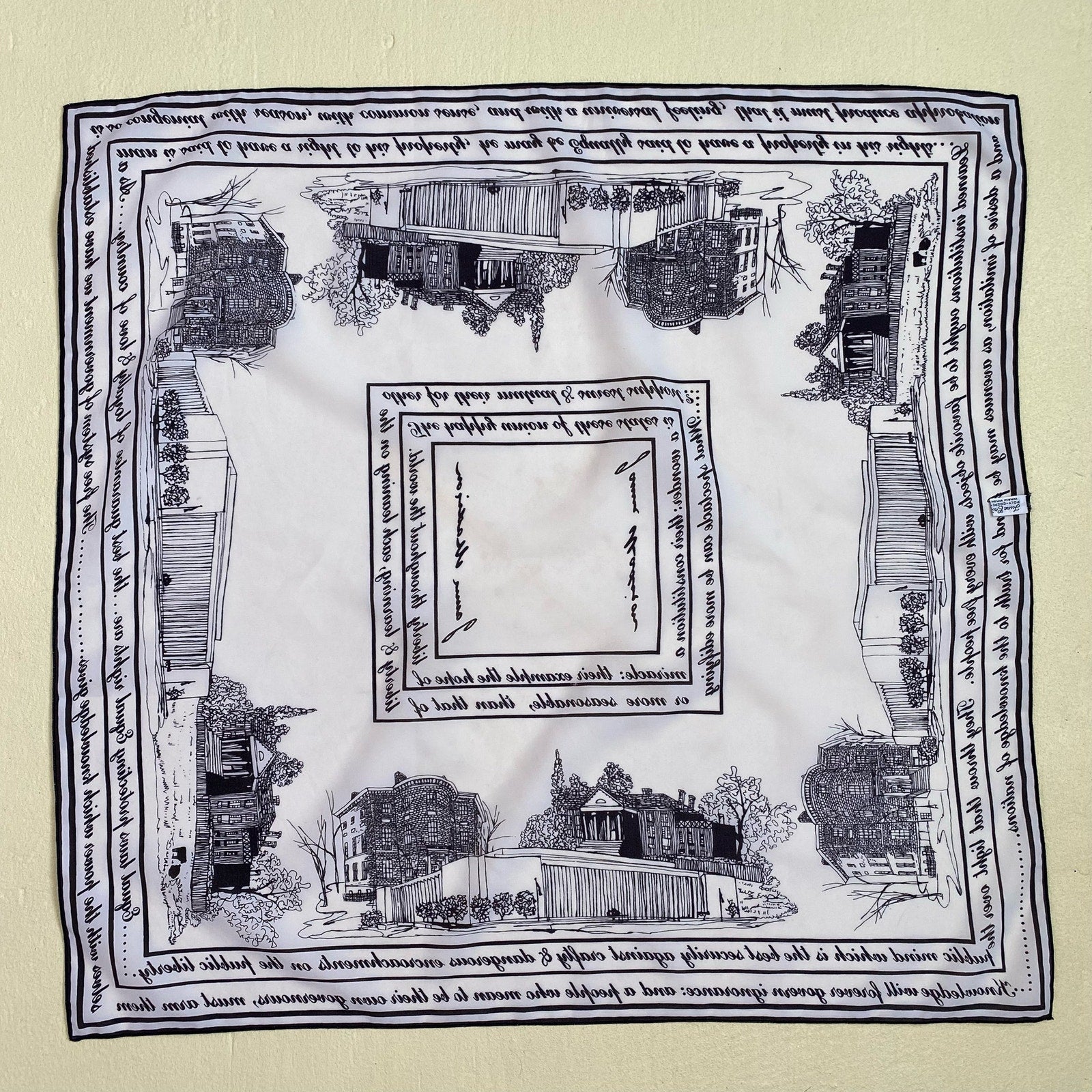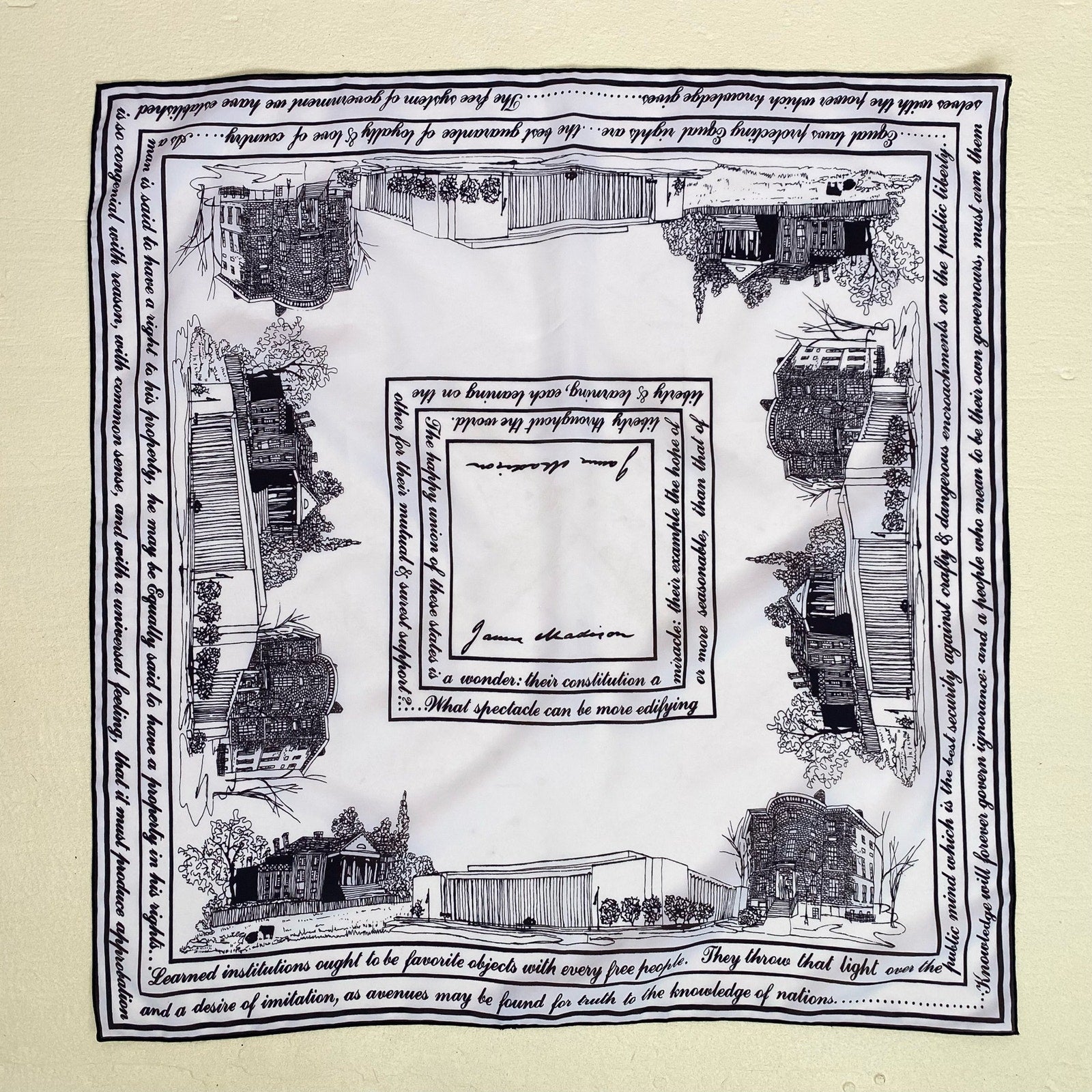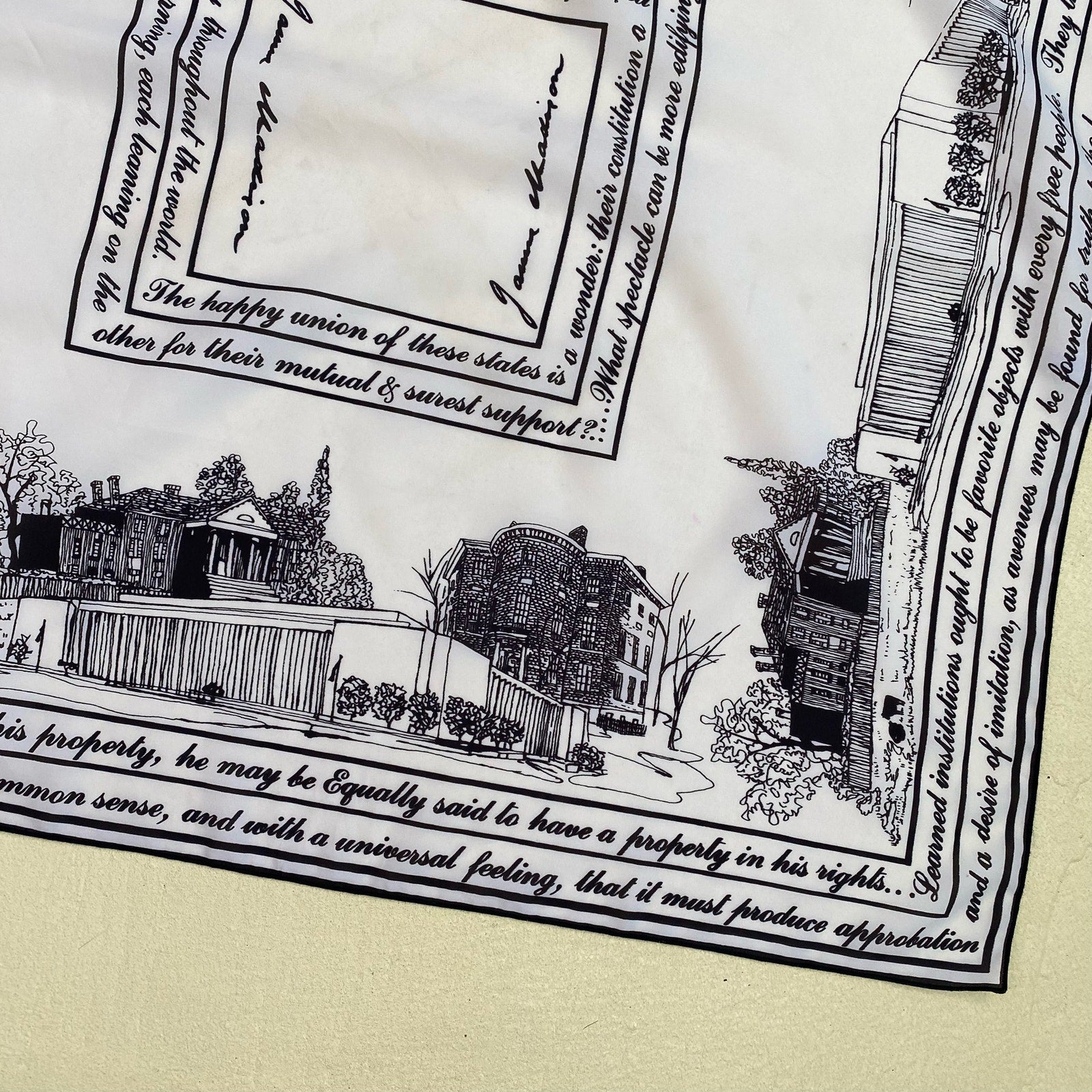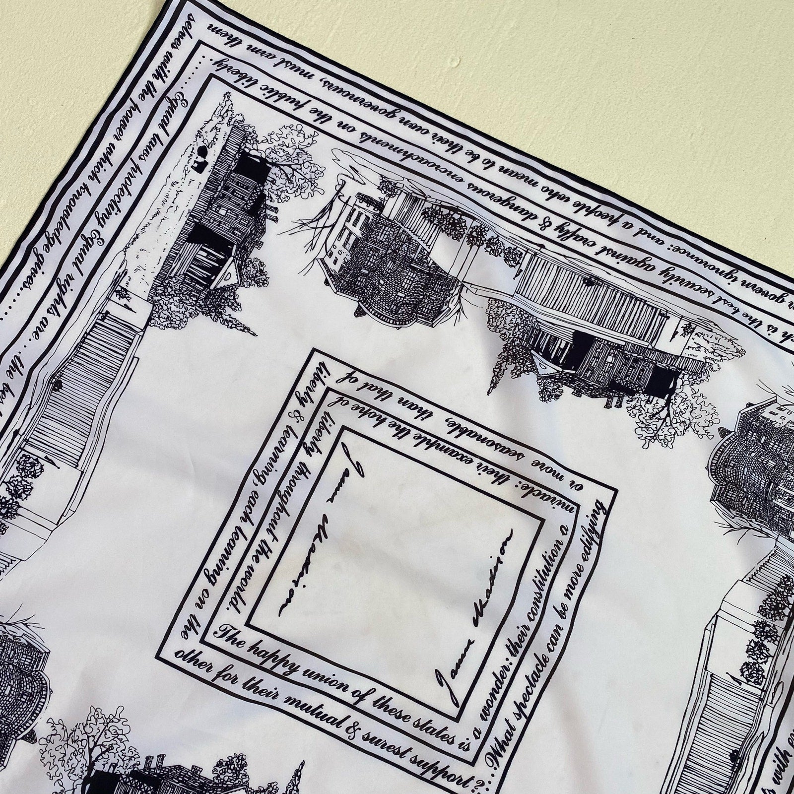 vintage black & white president James Madison quotes & buildings poly-crepe historical quotes square scarf. lightweight flowy lightly see through fabric. can be worn numerous fun ways! soft lightweight fabric. great for summer, accessorizing, festivals, etc
