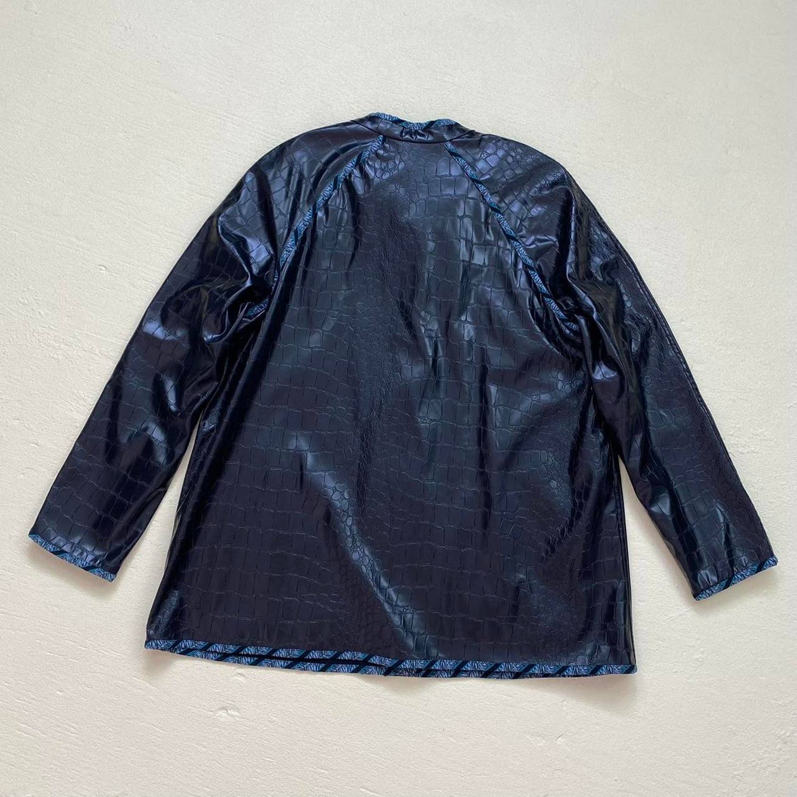 vegan crocodile embossed vinyl button up jacket that is fully reversible (tag easily removable) into a soft black button up jacket with croc detail.