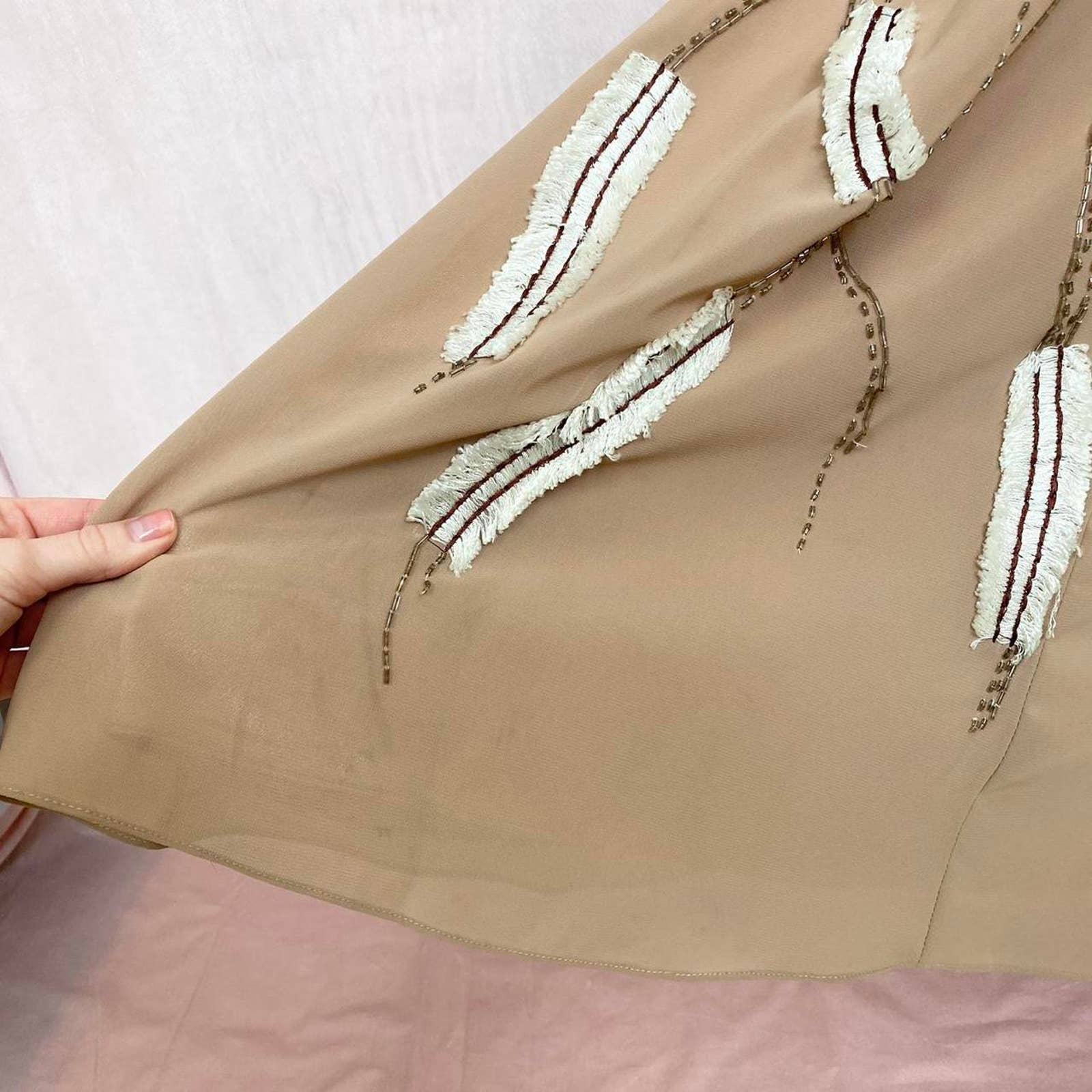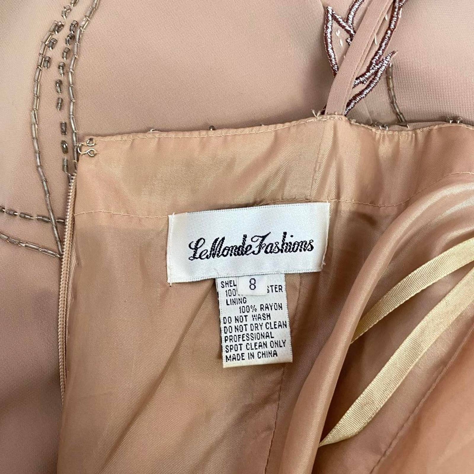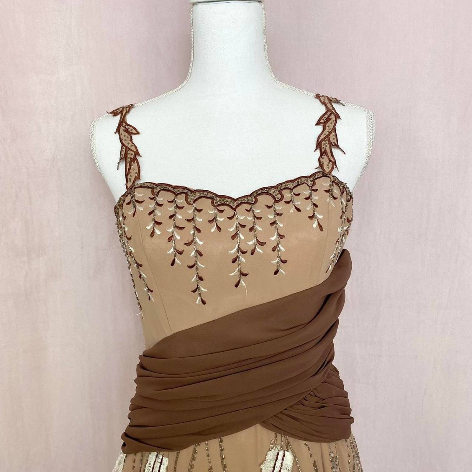 fit & flare embellished beaded embroidered brown formal gown long maxi dress. chiffon outer shell. draped waist detail lined. hidden back zip closure. fits best size small, but please see measurements!