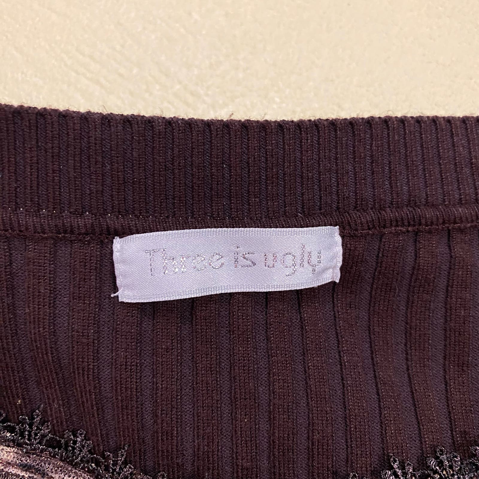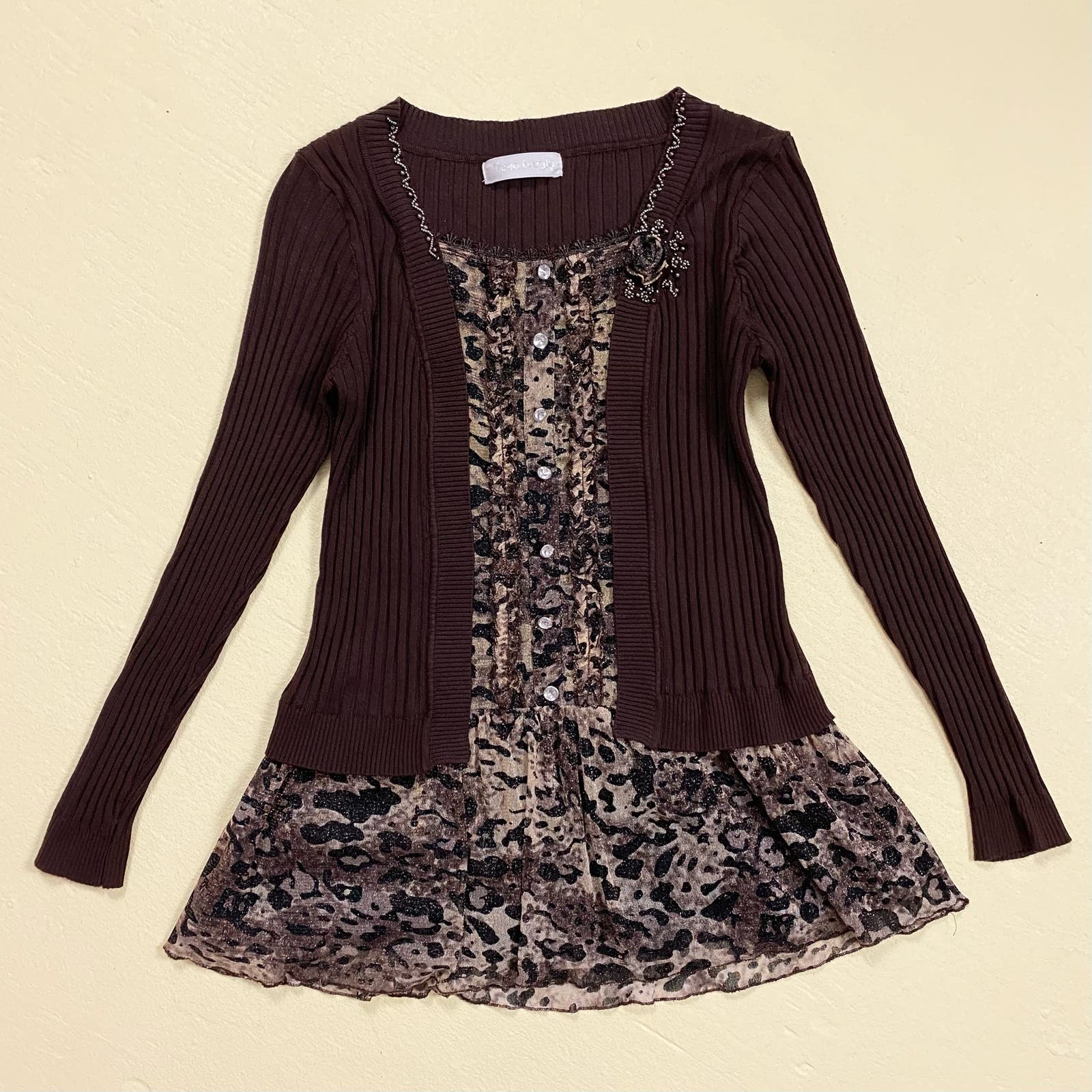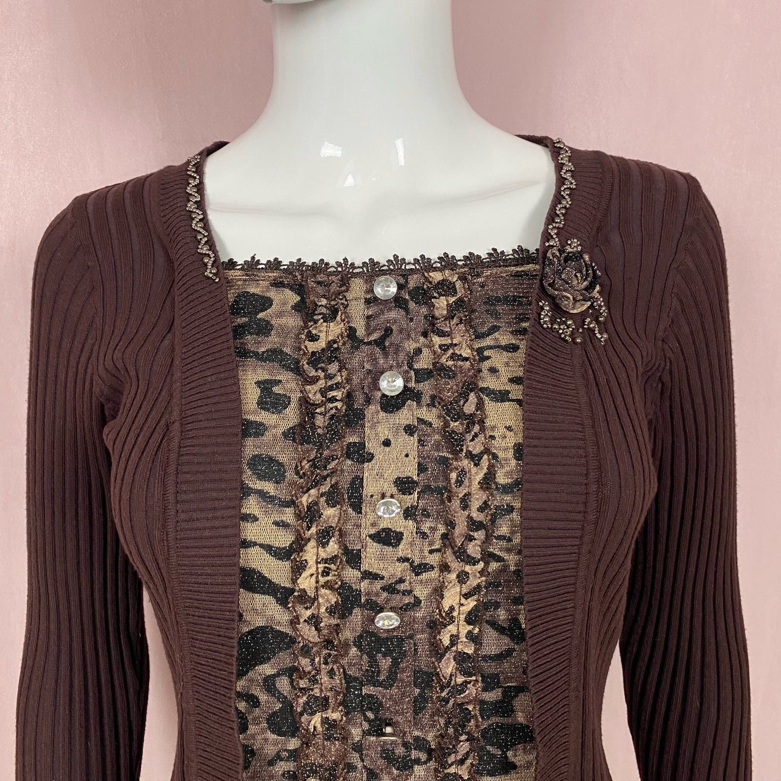 vintage Y2K "Three is ugly" beaded long brown rib knit cardigan sweater with built in leopard print metallic rhinestone faux button mesh top with ruffle detail & bottom trim. beaded neckline with floral embellishment. fitted style with flowy tiered bottom. lined. most likely youth size dress, best as long top, fits size small