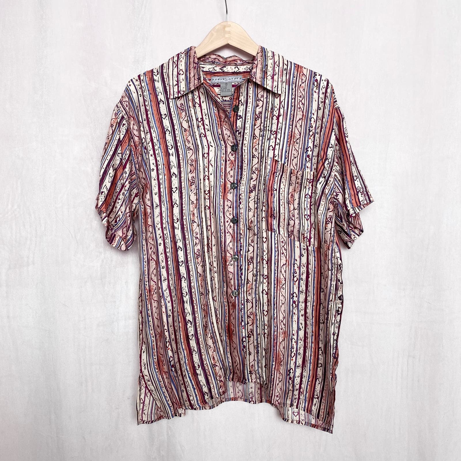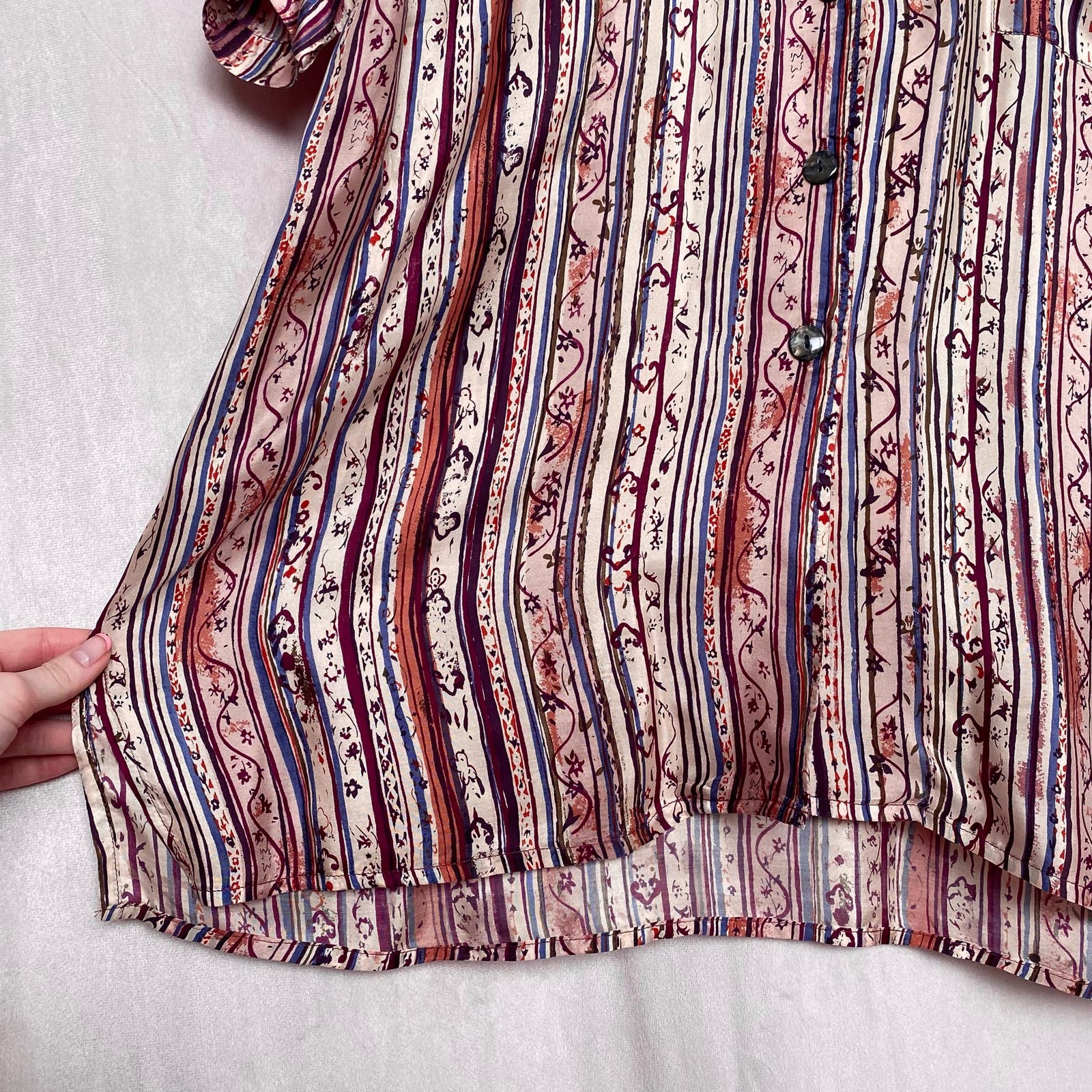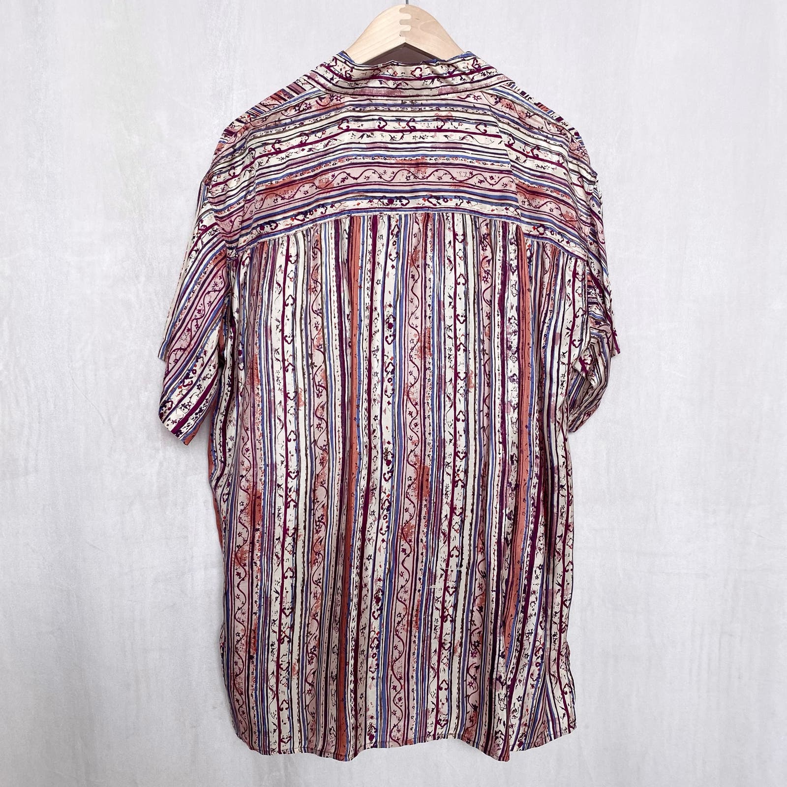 vintage silk boho striped print short sleeve oversized button down with collar & left chest pocket. marble buttons. flowy lightweight soft silk fabric. relaxed oversized fit. marked men’s medium, can fit up to men’s XL. please see measurements!