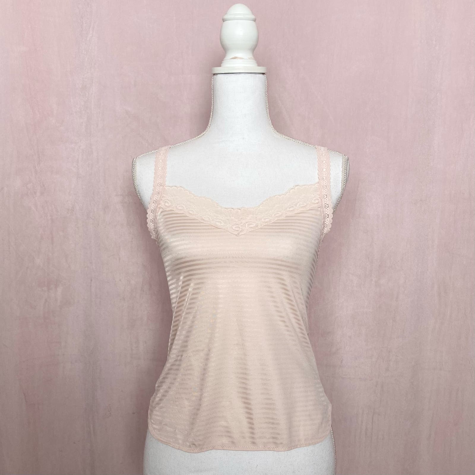 vintage satin-like stretchy lace trim pink/peach camisole tank top. lightly see through flowy stretch fabric. striped knit pattern. tag faded but i believe it is marked a size ‘34’ ? best fits small-medium - please see measurements!