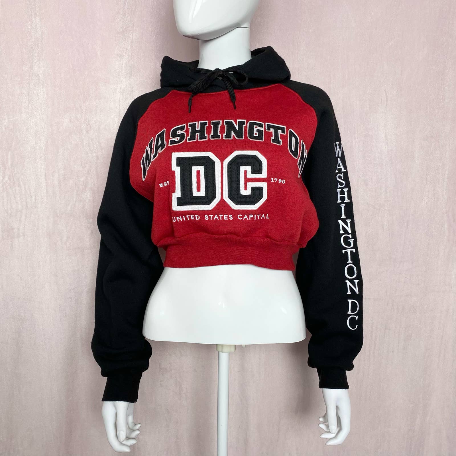 United States Capital red & black long sleeve cropped hooded sweatshirt. Washington DC patches knit on front & embroidered down left sleeve. adjustable hoodie drawstrings. thick soft acrylic material. oversize fit with cinched waist, fits best small / medium